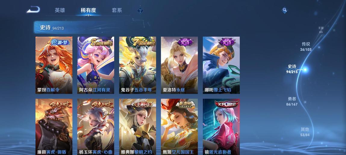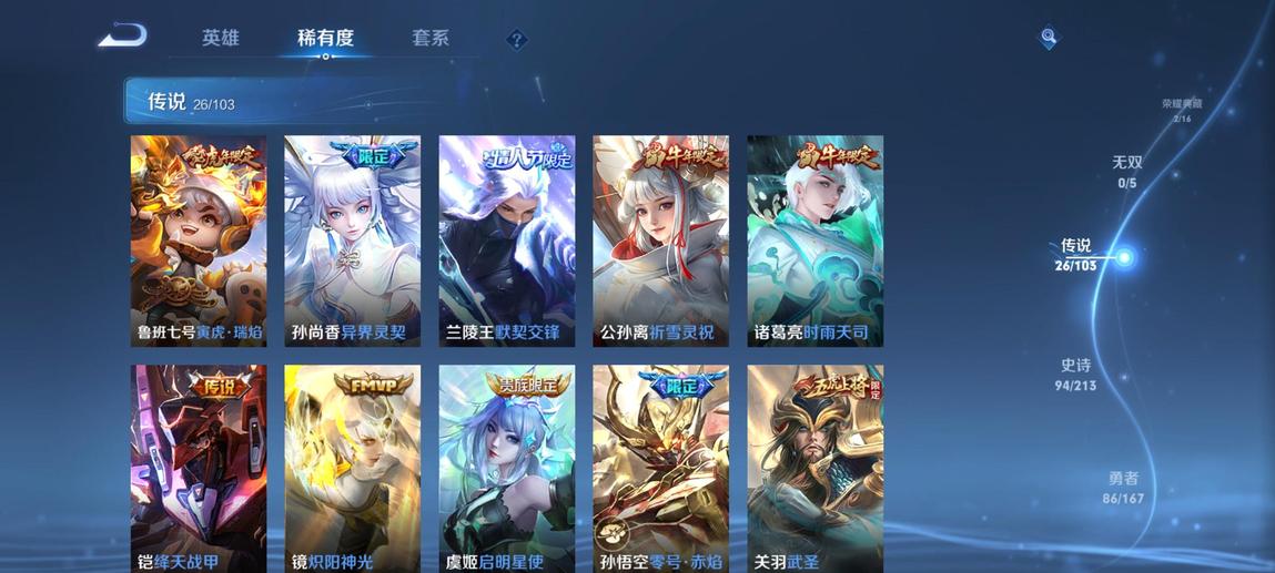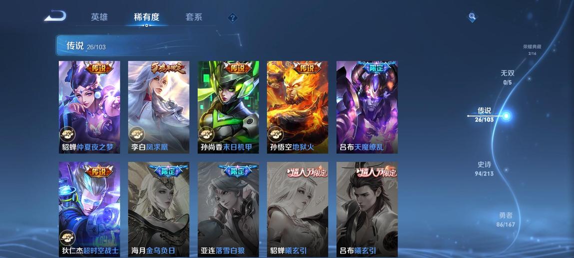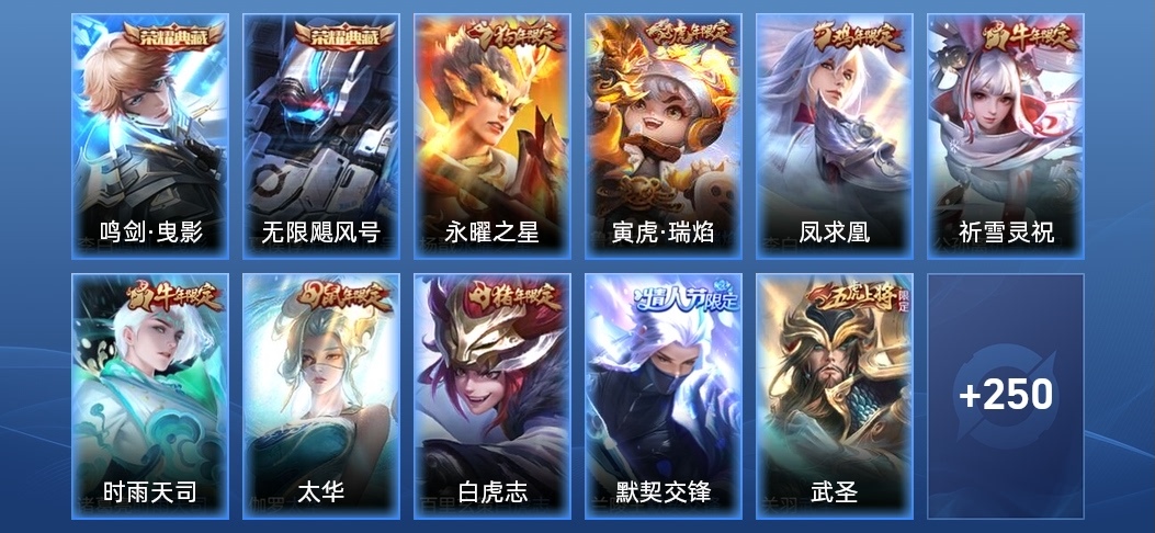 典韋-藍色畫面警告,裴擒虎-李小龍,鎧-青龍志,廉頗-寅虎·御盾,韓信-飛衡,嫦娥-拒霜思,米萊狄-胡桃異想國,項羽-霸王別姬,蘭陵王-馴魔獵人,百里玄策-原初追逐者,孫悟空-至尊寶,花木蘭-青春決賽季,甄姬-幽恆,百里守約-朱雀志,豬八戒-豬悟能,雲中君-纖雲弄巧,鏡-匿光追影者,鬼谷子-五穀豐年,黃忠-烈魂,東皇太一-逐夢之光,元歌-雲間偶戲,牛魔-奔雷神使,張飛-虎魄,蔡文姬-繁星吟遊,上官婉兒-梁祝,曹操-天狼征服者,李元芳-銀河之約,雅典娜-神奇女俠,魯班七號-獅舞東方,莊周-玄嵩,雅典娜-黎明之約,花木蘭-默契交鋒,趙雲-龍膽,呂布-御風驍將,狄仁傑-魔術師,阿軻-迷蹤麗影,孫悟空-孫行者,干將莫邪-真愛魔法,蒙犽-百解令,蒙犽-狂想玩偶喵,馬可波羅-暗影遊獵,裴擒虎-天狼狩獵者,典韋-岱宗,楊玉環-寅虎·心曲,羋月-白晶晶,馬超-神威,阿古朵-江河有靈,甄姬-女兒國國王,妲己-時之彼端,趙雲-皇家上將,嬴政-白晝王子,莊周-高山流水