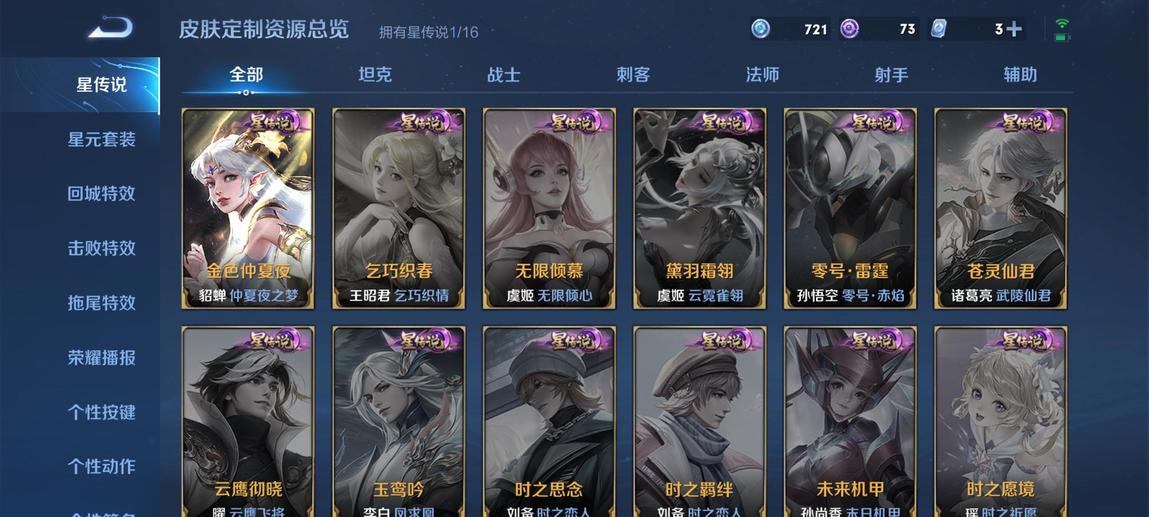 李元芳-特種部隊,花木蘭-劍舞者,女媧-尼羅河女神,夢奇-美夢成真,劉邦-德古拉伯爵,哪吒-三太子,李信-灼熱之刃,楊玉環-霓裳曲,大喬-守護之力,高漸離-金屬狂潮,呂布-野性能量,豬八戒-年年有餘,姜子牙-熾熱元素使,鍾無豔-生化警戒,鏡-冰刃幻境,程咬金-星際陸戰隊,李元芳-妄想特派,曹操-幽靈船長,老夫子-功夫老勺,亞瑟-心靈戰警,宮本武藏-永珍初新,雲中君-荷魯斯之眼,墨子-金屬風暴,瀾-孤獵,程咬金-功夫廚神,趙雲-未來紀元,諸葛亮-星航指揮官,娜可露露-晚螢,魯班大師-乓乓大師,甄姬-冰雪圓舞曲,露娜-緋紅之刃,扁鵲-救世之瞳,趙雲-白執事,花木蘭-水晶獵龍者,孫策-海之征途,韓信-白龍吟,曜-歸虛夢演,墨子-龍騎士,白起-星夜王子,哪吒-雪上飛焰,孫臏-歸虛夢演,阿軻-愛心護理,劉禪-紳士熊喵,蘭陵王-暗隱獵獸者,百里守約-絕影神槍,典韋-黃金武士,盾山-圓桌騎士,大喬-白蛇,不知火舞-魅語,孫尚香-水果甜心,曹操-死神來了,甄姬-花好人間,劉邦-聖殿之光,狄仁傑-鷹眼統帥,沈夢溪-鯊炮海盜貓,花木蘭-兔女郎,魯班七號-黑桃隊長,周瑜-海軍大將,劉備-漢昭烈帝,姜子牙-時尚教父,諸葛亮-黃金分割率,劉禪-英喵野望,嬴政-搖滾巨星,劉禪-秘密基地,黃忠-芝加哥教父,阿軻-節奏熱浪,蘇烈-堅韌之力,扁鵲-化身博士,李元芳-逐浪之夏,露娜-瓷語鑑心,牛魔-制霸全明星,趙雲-忍·炎影,百里玄策-威尼斯狂歡,阿古朵-熊喵少女,雲纓-赤焰之纓,妲己-少女阿狸,王昭君-精靈公主,司馬懿-魘語軍師,白起-白色死神,后羿-精靈王,公孫離-花間舞,魯班大師-歸虛夢演,桑啟-畫中遊,貂蟬-聖誕戀歌,嫦娥-露花倒影,馬超-倖存者,西施-詩語江南,廉頗-地獄巖魂,孫臏-未來旅行,露娜-紫霞仙子,盾山-極冰防禦線,達摩-大發明家,程咬金-無雙福將,上官婉兒-修竹墨客,項羽-科學大爆炸,張飛-五福同心,司空震-啟蟄,盤古-創世神祝,百里玄策-熱力迴旋,孫策-貓狗日記,小喬-青蛇,蒙犽-歸虛夢演,安琪拉-心靈駭客,橘右京-修羅,虞姬-加勒比小姐,劉禪-天才門將,韓信-教廷特使,馬可波羅-潮玩牛仔,蒙恬-秩序獵龍將,莊周-奇妙博物學,項羽-蒼穹之光,劉備-紐約教父,魯班七號-電玩小子,楊戩-次元傲視,夏洛特-永晝,安琪拉-時之奇旅,孫臏-天使之翼,干將莫邪-第七人偶,王昭君-偶像歌手,蔡文姬-薔薇王座,哪吒-次元突破,馬可波羅-激情綠茵,暃-碧珀緋影,盤古-重灌意志,張良-繽紛繪卷,雅典娜-戰爭女神,張良-古海尋蹤,達摩-拳王,元歌-午夜歌劇院,鍾無豔-聚星閃耀,孫尚香-沉穩之力,夏侯惇-乘風破浪,宮本武藏-鬼劍武藏,羋月-紅桃皇后,瑤-森,成吉思汗-維京掠奪者,鍾無豔-海灘麗影,廉頗-無盡征程,狂鐵-特工戰影,大喬-伊勢巫女,呂布-聖誕狂歡,小喬-丁香結,妲己-女僕咖啡,蒙恬-蔚藍守將,東皇太一-東海龍王,太乙真人-圓桌騎士
