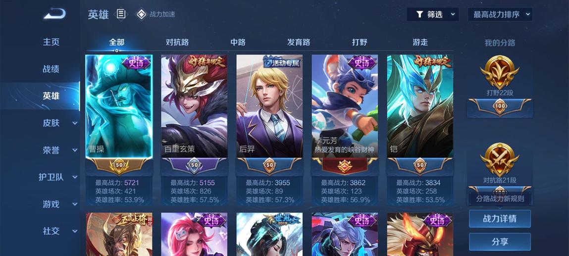 阿軻,魯班七號,盤古,米萊狄,大喬,東皇太一,韓信,豬八戒,亞瑟,西施,李元芳,女媧,貂蟬,孫策,弈星,夏侯惇,程咬金,扁鵲,蔡文姬,狄仁傑,小喬,狂鐵,露娜,楊玉環,盾山,明世隱,張良,司馬懿,鍾無豔,成吉思汗,趙懷真,安琪拉,花木蘭,孫臏,蒙犽,夏洛特,牛魔,鏡,虞姬,李信,蘭陵王,哪吒,元歌,典韋,艾琳,甄姬,劉禪,雅典娜,干將莫邪,夢奇,鬼谷子,阿古朵,海諾,莊周,妲己,項羽,瑤,達摩,后羿,海月,嬴政,馬可波羅,暃,呂布,劉邦,馬超,金蟬,亞連,黃忠,司空震,羋月,白起,太乙真人,娜可露露,瀾,關羽,墨子,百里守約,趙雲,老夫子,魯班大師,伽羅,張飛,朵莉亞,諸葛亮,孫悟空,上官婉兒,姜子牙,孫尚香,雲纓,裴擒虎,不知火舞,姬小滿,楊戩,萊西奧,蘇烈,鍾馗,高漸離,廉頗,公孫離,曜,鎧,李白,蒙恬,劉備,王昭君,橘右京,沈夢溪,百里玄策,雲中君,戈婭,桑啟,嫦娥,宮本武藏,敖隱,曹操,周瑜