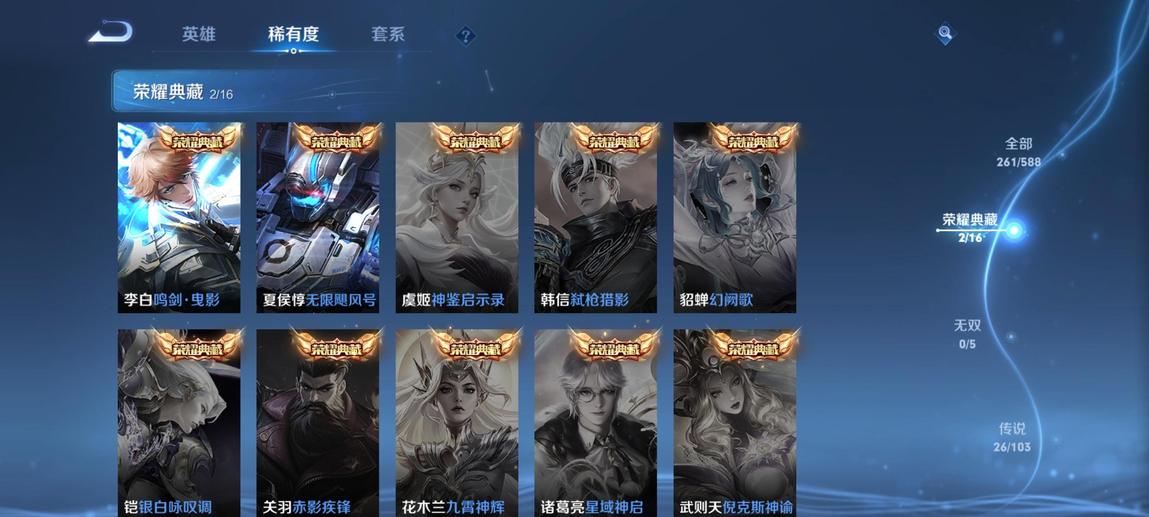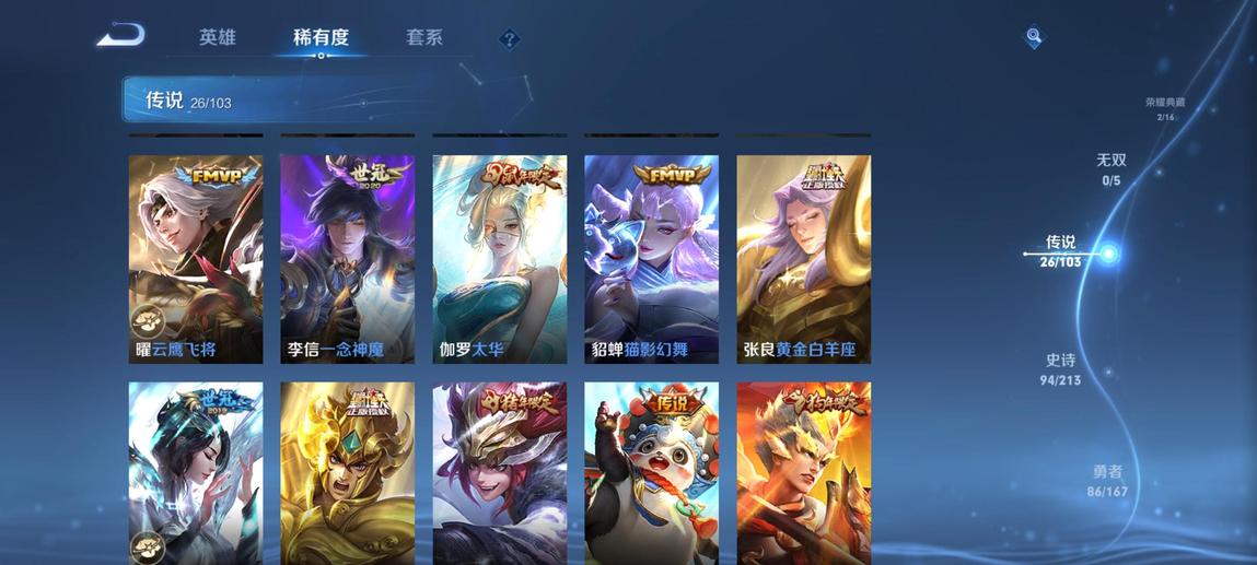 典韋-藍色畫面警告,裴擒虎-李小龍,鎧-青龍志,廉頗-寅虎·御盾,韓信-飛衡,嫦娥-拒霜思,米萊狄-胡桃異想國,項羽-霸王別姬,蘭陵王-馴魔獵人,百里玄策-原初追逐者,孫悟空-至尊寶,花木蘭-青春決賽季,甄姬-幽恆,百里守約-朱雀志,豬八戒-豬悟能,雲中君-纖雲弄巧,鏡-匿光追影者,鬼谷子-五穀豐年,黃忠-烈魂,東皇太一-逐夢之光,元歌-雲間偶戲,牛魔-奔雷神使,張飛-虎魄,蔡文姬-繁星吟遊,上官婉兒-梁祝,曹操-天狼征服者,李元芳-銀河之約,雅典娜-神奇女俠,魯班七號-獅舞東方,莊周-玄嵩,雅典娜-黎明之約,花木蘭-默契交鋒,趙雲-龍膽,呂布-御風驍將,狄仁傑-魔術師,阿軻-迷蹤麗影,孫悟空-孫行者,干將莫邪-真愛魔法,蒙犽-百解令,蒙犽-狂想玩偶喵,馬可波羅-暗影遊獵,裴擒虎-天狼狩獵者,典韋-岱宗,楊玉環-寅虎·心曲,羋月-白晶晶,馬超-神威,阿古朵-江河有靈,甄姬-女兒國國王,妲己-時之彼端,趙雲-皇家上將,嬴政-白晝王子,莊周-高山流水