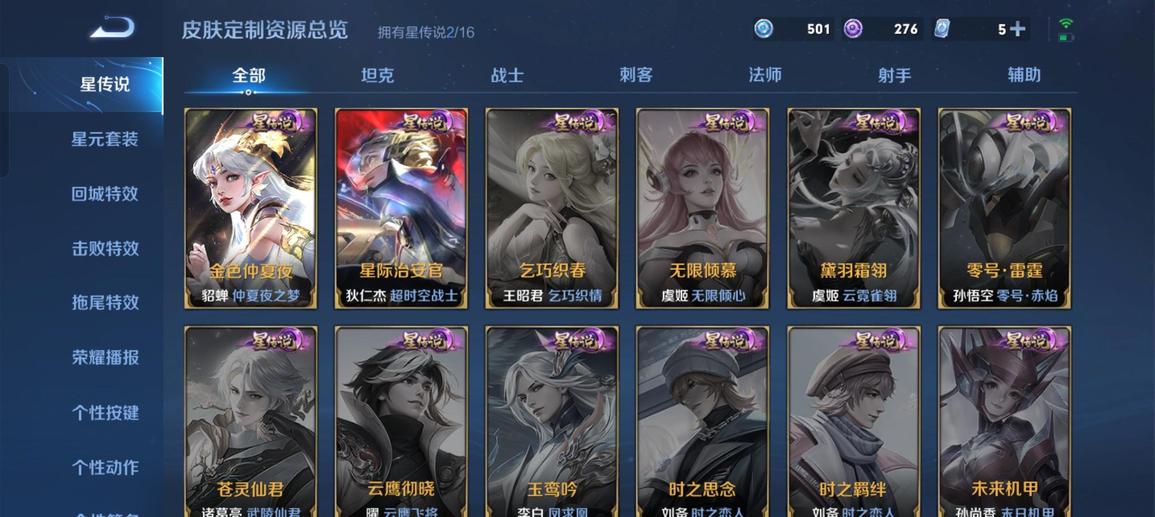 孫悟空-大聖娶親,嬴政-優雅戀人,典韋-藍色畫面警告,裴擒虎-李小龍,墨子-降魔,鍾無豔-王者之錘,扁鵲-奇幻香蹤,明世隱-吟遊魔法,鎧-青龍志,高漸離-燃音魔法,嫦娥-拒霜思,貂蟬-逐夢之音,甄姬-遊園驚夢,米萊狄-胡桃異想國,蘭陵王-馴魔獵人,狄仁傑-魔術師,阿軻-迷蹤麗影,百里玄策-原初追逐者,楊玉環-遇見飛天,戈婭-馭風魔法,干將莫邪-真愛魔法,伽羅-琥珀紀元,蒙犽-百解令,豬八戒-豬悟能,司空震-地獄燃心,雲中君-纖雲弄巧,蒙犽-狂想玩偶喵,鬼谷子-五穀豐年,馬可波羅-暗影遊獵,狂鐵-電玩高手,元歌-雲間偶戲,夢奇-頑趣,周瑜-雪夜綺願,鍾無豔-超時空戰士,阿古朵-江河有靈,馬可波羅-山海·玄木吟,蔡文姬-繁星吟遊,元歌-無心,趙雲-皇家上將,上官婉兒-梁祝,李元芳-銀河之約,嬴政-白晝王子,暃-星界遊俠,黃忠-火炮紳士,老夫子-航海奇遇記,雅典娜-黎明之約,莊周-高山流水