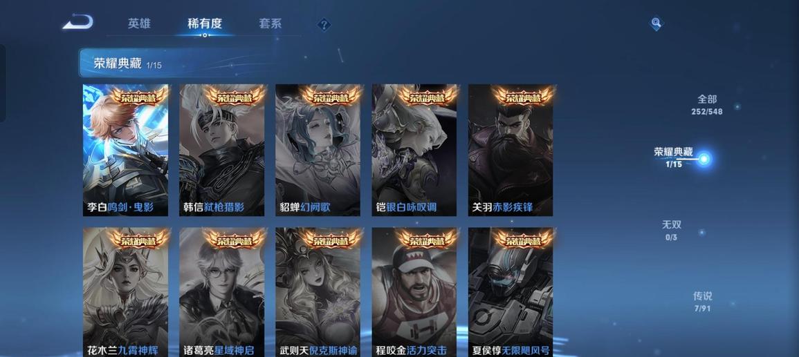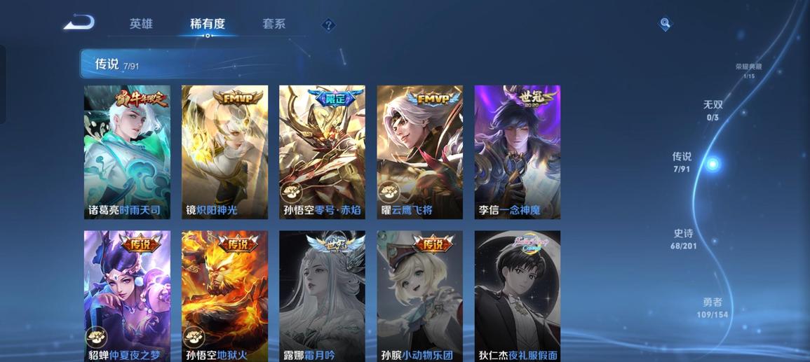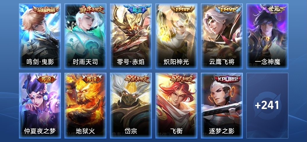 蘭陵王-隱刃,張飛-亂世虎臣,李元芳-特種部隊,女媧-尼羅河女神,豬八戒-潮玩探月行,明世隱-虹雲星官,夢奇-美夢成真,沈夢溪-棒球奇才,哪吒-三太子,李信-灼熱之刃,楊玉環-霓裳曲,大喬-守護之力,裴擒虎-街頭旋風,海月-幻泉霧影,高漸離-金屬狂潮,呂布-野性能量,豬八戒-年年有餘,姜子牙-熾熱元素使,狄仁傑-錦衣衛,鍾無豔-生化警戒,鏡-冰刃幻境,老夫子-潮流仙人,曹操-超能戰警,戈婭-危途狂花,程咬金-星際陸戰隊,李元芳-妄想特派,曹操-幽靈船長,亞瑟-死亡騎士,老夫子-功夫老勺,亞瑟-心靈戰警,宮本武藏-永珍初新,孫悟空-西部大鏢客,趙懷真-太極少年,安琪拉-如懿,墨子-金屬風暴,瀾-孤獵,程咬金-功夫廚神,亞連-破局者,趙雲-未來紀元,諸葛亮-星航指揮官,娜可露露-晚螢,甄姬-冰雪圓舞曲,魯班大師-乓乓大師,露娜-緋紅之刃,韓信-街頭霸王,孫策-海之征途,韓信-白龍吟,曜-歸虛夢演,白起-星夜王子,孫臏-歸虛夢演,阿軻-愛心護理,伽羅-花見巫女,蘭陵王-暗隱獵獸者,百里守約-絕影神槍,典韋-黃金武士,盾山-圓桌騎士,孫尚香-水果甜心,曹操-死神來了,呂布-末日機甲,甄姬-花好人間,劉邦-聖殿之光,狄仁傑-鷹眼統帥,沈夢溪-鯊炮海盜貓,花木蘭-兔女郎,米萊狄-精準探案法,劉備-漢昭烈帝,諸葛亮-掌控之力,姜子牙-時尚教父,諸葛亮-黃金分割率,劉禪-英喵野望,嬴政-搖滾巨星,劉禪-秘密基地,弈星-踏雪尋梅,明世隱-占星師,李白-範海辛,黃忠-芝加哥教父,阿軻-節奏熱浪,蘇烈-堅韌之力,李元芳-逐浪之夏,露娜-瓷語鑑心,小喬-萬聖前夜,扁鵲-化身博士,蘇烈-愛與和平,牛魔-制霸全明星,魯班七號-福祿兄弟,趙雲-忍·炎影,百里玄策-威尼斯狂歡,阿古朵-熊喵少女,雲纓-赤焰之纓,王昭君-精靈公主,妲己-少女阿狸,司馬懿-魘語軍師,白起-白色死神,公孫離-花間舞,魯班大師-歸虛夢演,桑啟-畫中遊,貂蟬-聖誕戀歌,嫦娥-露花倒影,小喬-繽紛獨角獸,馬超-倖存者,宮本武藏-霸王丸,廉頗-地獄巖魂,孫臏-未來旅行,白起-樂園追獵者,達摩-大發明家,上官婉兒-修竹墨客,程咬金-無雙福將,項羽-科學大爆炸,金蟬-前塵,張飛-五福同心,司空震-啟蟄,盤古-創世神祝,百里玄策-熱力迴旋,鬼谷子-幻樂之宴,孫策-貓狗日記,蒙犽-歸虛夢演,安琪拉-心靈駭客,橘右京-修羅,虞姬-加勒比小姐,牛魔-牛運亨通,劉禪-天才門將,關羽-龍騰萬里,韓信-教廷特使,李白-千年之狐,馬可波羅-潮玩牛仔,莊周-奇妙博物學,蒙恬-秩序獵龍將,項羽-蒼穹之光,劉備-紐約教父,露娜-哥特玫瑰,楊戩-次元傲視,劉備-萬事如意,孫臏-天使之翼,干將莫邪-第七人偶,王昭君-偶像歌手,貂蟬-異域舞娘,蔡文姬-薔薇王座,哪吒-次元突破,馬可波羅-激情綠茵,暃-碧珀緋影,李白-敏銳之力,公孫離-無限星賞官,妲己-魅力維加斯,盤古-重灌意志,張良-繽紛繪卷,雅典娜-戰爭女神,張良-古海尋蹤,元歌-午夜歌劇院,達摩-拳王,鍾無豔-聚星閃耀,楊戩-埃及法老,孫尚香-沉穩之力,夏侯惇-乘風破浪,鍾馗-地府判官,宮本武藏-鬼劍武藏,羋月-紅桃皇后,趙雲-嘻哈天王,瑤-森,夏侯惇-戰爭騎士,成吉思汗-維京掠奪者,海月-王牌新星,鍾無豔-海灘麗影,后羿-阿爾法小隊,狂鐵-特工戰影,小喬-丁香結,鎧-龍域領主,妲己-女僕咖啡,蒙恬-蔚藍守將,東皇太一-東海龍王