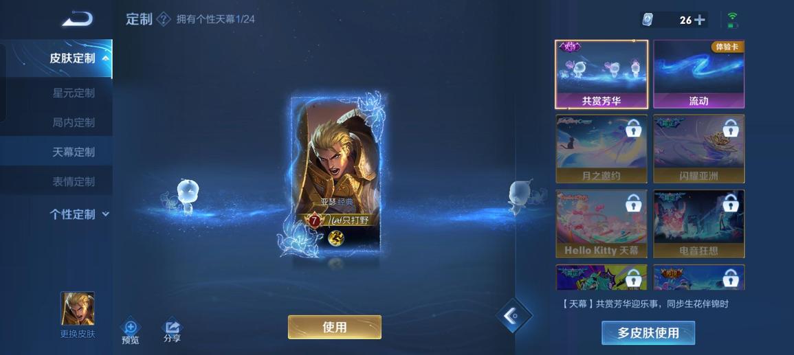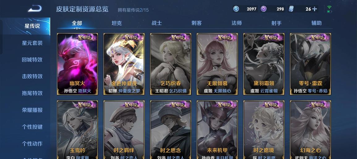 裴擒虎-李小龍,明世隱-吟遊魔法,韓信-飛衡,嫦娥-拒霜思,米萊狄-胡桃異想國,蘭陵王-馴魔獵人,狄仁傑-魔術師,阿軻-迷蹤麗影,楊玉環-遇見飛天,關羽-冰鋒戰神,干將莫邪-真愛魔法,雲中君-纖雲弄巧,蒙犽-狂想玩偶喵,鏡-匿光追影者,鬼谷子-五穀豐年,馬可波羅-暗影遊獵,韓信-傲雪梅槍,韓信-逐夢之影,典韋-岱宗,元歌-雲間偶戲,鍾無豔-超時空戰士,阿古朵-江河有靈,蔡文姬-繁星吟遊,元歌-無心,上官婉兒-梁祝,趙雲-皇家上將,李元芳-銀河之約,暃-星界遊俠,黃忠-火炮紳士,魯班七號-獅舞東方,老夫子-航海奇遇記,雅典娜-黎明之約,莊周-高山流水