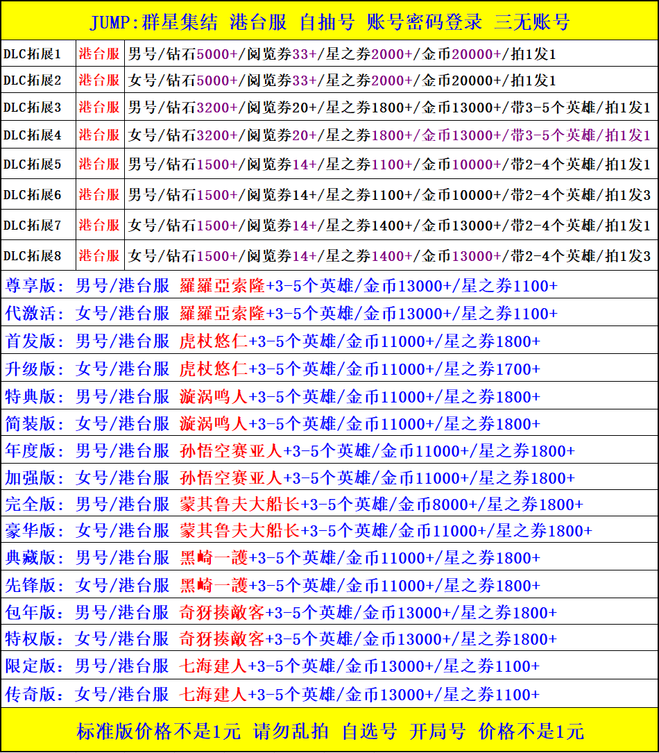 全 8591 首家 JUMP:群星集結初始號港台服石頭自選開局組合資源鑽石台服自抽號