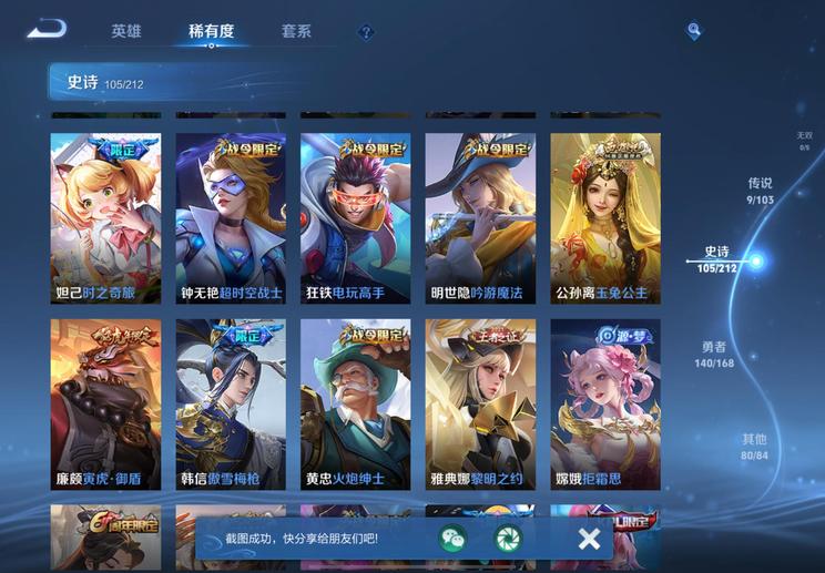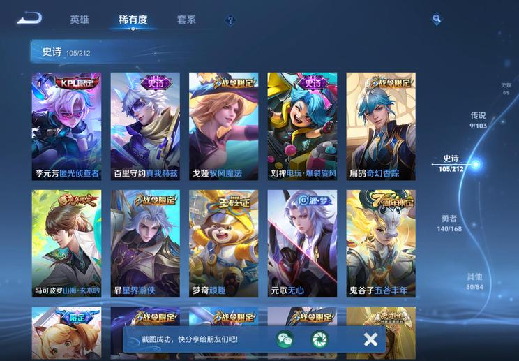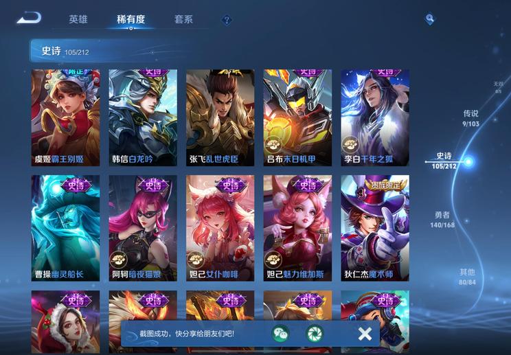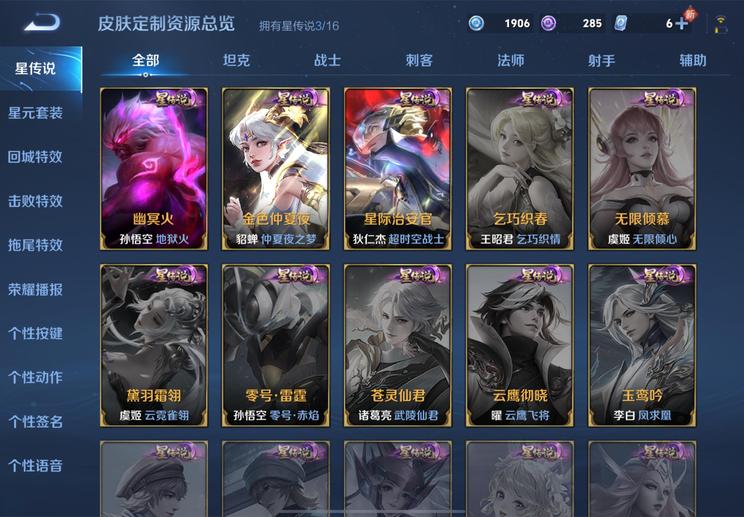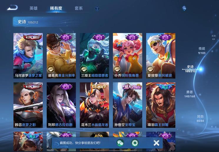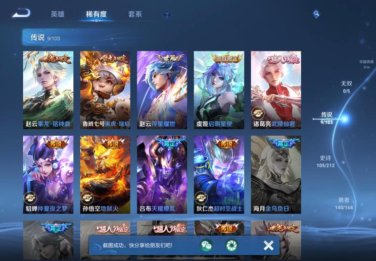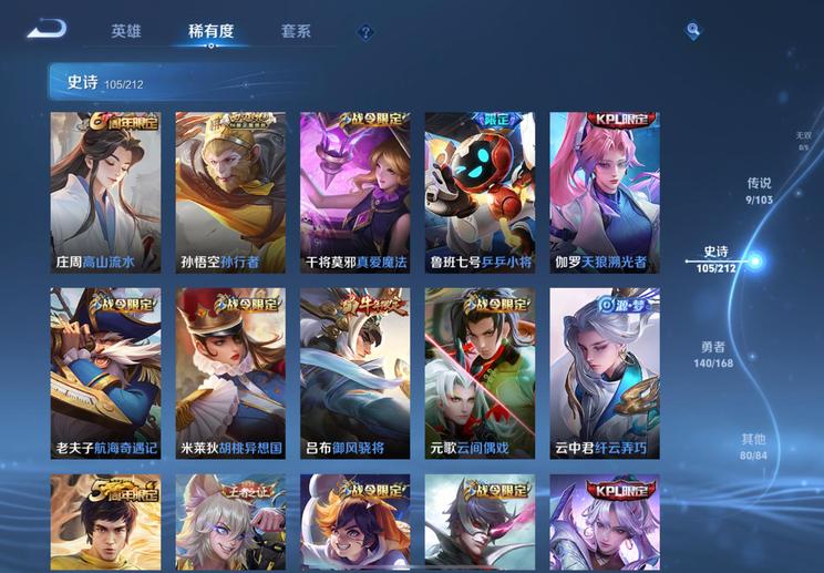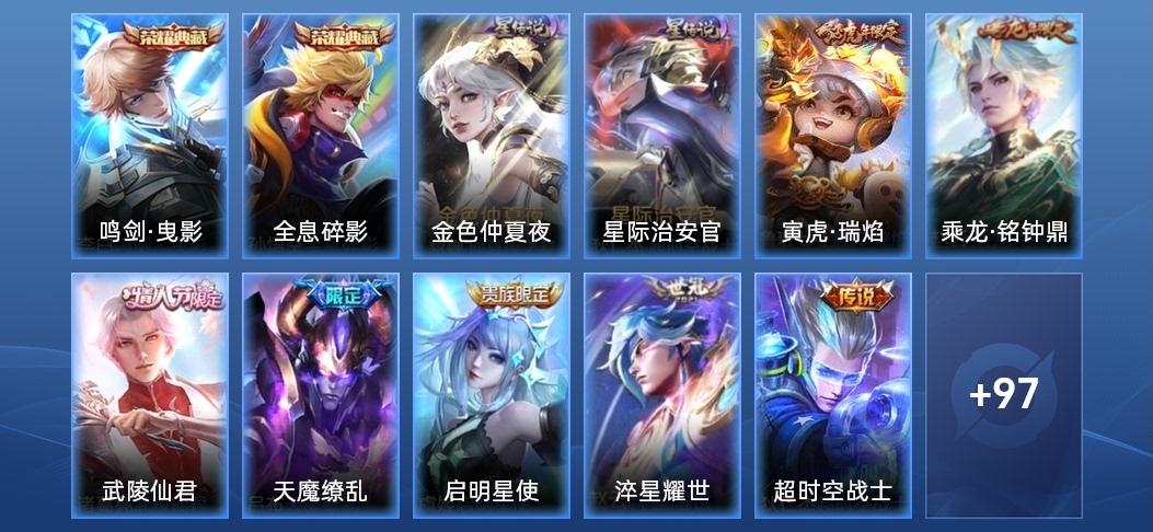 裴擒虎-李小龍,明世隱-吟遊魔法,廉頗-寅虎·御盾,嫦娥-拒霜思,李元芳-匿光偵查者,米萊狄-胡桃異想國,項羽-霸王別姬,蘭陵王-馴魔獵人,孫悟空-至尊寶,魯班七號-蔬鄉物語,百里玄策-原初追逐者,魯班七號-乒乒小將,戈婭-馭風魔法,露娜-一生所愛,伽羅-琥珀紀元,雲中君-纖雲弄巧,鬼谷子-五穀豐年,狂鐵-電玩高手,元歌-雲間偶戲,孫尚香-薔薇戀人,鍾無豔-超時空戰士,周瑜-雪夜綺願,后羿-如夢令,蔡文姬-繁星吟遊,上官婉兒-梁祝,元歌-無心,李元芳-銀河之約,暃-星界遊俠,老夫子-航海奇遇記,雅典娜-黎明之約,孫悟空-大聖娶親,蒙恬-榮光聖徽,扁鵲-奇幻香蹤,高漸離-燃音魔法,上官婉兒-天狼繪夢者,呂布-御風驍將,狄仁傑-魔術師,阿軻-迷蹤麗影,孫悟空-孫行者,楊玉環-遇見飛天,姬小滿-妄想食味,虞姬-霸王別姬,干將莫邪-真愛魔法,蒙犽-百解令,馬可波羅-逐夢之星,蒙犽-狂想玩偶喵,司空震-地獄燃心,馬可波羅-暗影遊獵,妲己-時之奇旅,韓信-逐夢之影,韓信-傲雪梅槍,典韋-岱宗,大喬-乘龍·憶丹青,夢奇-頑趣,伽羅-天狼溯光者,阿古朵-江河有靈,馬可波羅-山海·玄木吟,妲己-時之彼端,黃忠-火炮紳士,莊周-高山流水