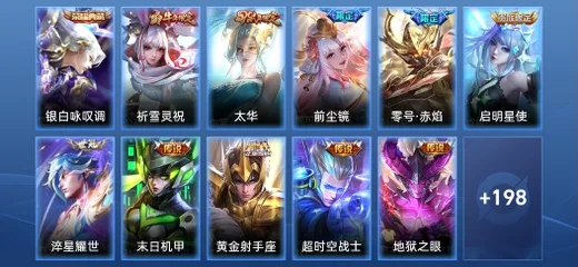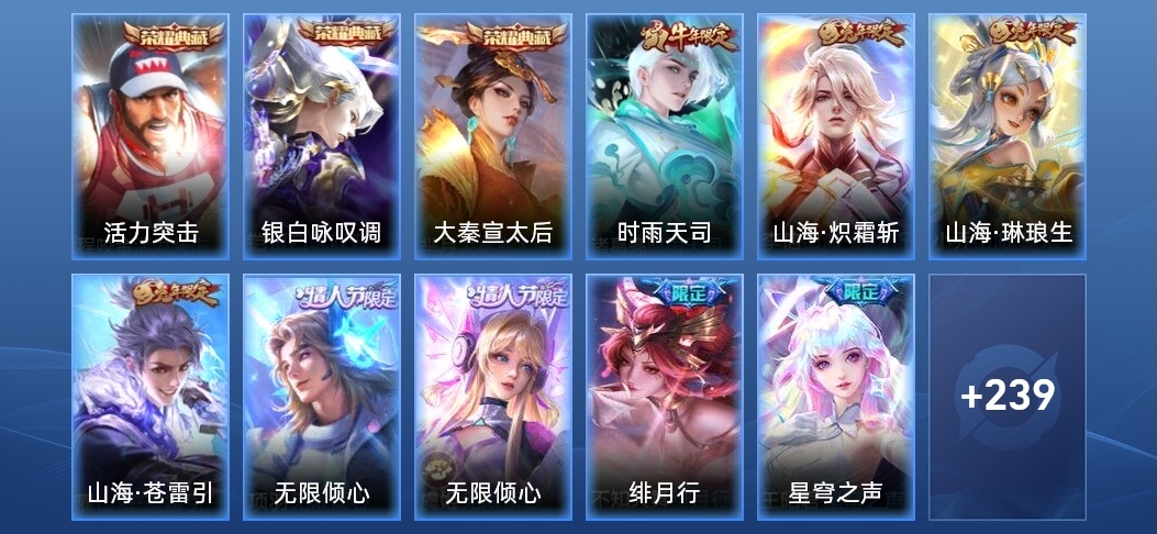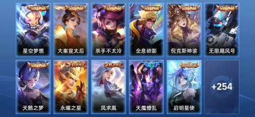 蘭陵王-隱刃,張飛-亂世虎臣,李元芳-特種部隊,女媧-尼羅河女神,豬八戒-潮玩探月行,明世隱-虹雲星官,王昭君-幻想奇妙夜,劉邦-德古拉伯爵,夢奇-美夢成真,哪吒-三太子,妲己-紫羅蘭之誓,關羽-天啟騎士,李信-灼熱之刃,楊玉環-霓裳曲,大喬-守護之力,裴擒虎-街頭旋風,海月-幻泉霧影,牛魔-西部大鏢客,高漸離-金屬狂潮,呂布-野性能量,姜子牙-熾熱元素使,狄仁傑-錦衣衛,鏡-冰刃幻境,老夫子-潮流仙人,曹操-超能戰警,程咬金-星際陸戰隊,戈婭-危途狂花,曹操-幽靈船長,亞瑟-死亡騎士,老夫子-功夫老勺,劉備-潮玩造夢師,孫悟空-西部大鏢客,宮本武藏-永珍初新,趙懷真-太極少年,墨子-金屬風暴,瀾-孤獵,程咬金-功夫廚神,趙雲-未來紀元,諸葛亮-星航指揮官,鬼谷子-阿摩司公爵,甄姬-冰雪圓舞曲,露娜-緋紅之刃,阿軻-致命風華,趙雲-白執事,孫策-海之征途,曜-歸虛夢演,白起-星夜王子,哪吒-雪上飛焰,阿軻-愛心護理,伽羅-花見巫女,孫臏-歸虛夢演,劉禪-紳士熊喵,百里守約-絕影神槍,蘭陵王-暗隱獵獸者,盾山-圓桌騎士,孫尚香-水果甜心,曹操-死神來了,甄姬-花好人間,劉邦-聖殿之光,狄仁傑-鷹眼統帥,沈夢溪-鯊炮海盜貓,花木蘭-兔女郎,魯班七號-黑桃隊長,劉備-漢昭烈帝,周瑜-海軍大將,諸葛亮-掌控之力,雅典娜-冰冠公主,姜子牙-時尚教父,諸葛亮-黃金分割率,劉禪-英喵野望,嬴政-搖滾巨星,劉禪-秘密基地,黃忠-芝加哥教父,弈星-踏雪尋梅,明世隱-占星師,李白-範海辛,阿軻-節奏熱浪,蘇烈-堅韌之力,小喬-萬聖前夜,李元芳-逐浪之夏,扁鵲-化身博士,蘇烈-愛與和平,魯班七號-福祿兄弟,牛魔-制霸全明星,趙雲-忍·炎影,百里玄策-威尼斯狂歡,西施-歸虛夢演,雲纓-赤焰之纓,妲己-少女阿狸,司馬懿-魘語軍師,白起-白色死神,后羿-精靈王,公孫離-花間舞,魯班大師-歸虛夢演,桑啟-畫中遊,貂蟬-聖誕戀歌,馬超-倖存者,宮本武藏-霸王丸,宮本武藏-未來紀元,廉頗-地獄巖魂,孫臏-未來旅行,白起-樂園追獵者,達摩-大發明家,程咬金-無雙福將,上官婉兒-修竹墨客,金蟬-前塵,張飛-五福同心,司空震-啟蟄,盤古-創世神祝,鬼谷子-幻樂之宴,孫策-貓狗日記,蒙犽-歸虛夢演,安琪拉-心靈駭客,魯班七號-木偶奇遇記,牛魔-牛運亨通,關羽-龍騰萬里,韓信-教廷特使,蒙恬-秩序獵龍將,項羽-蒼穹之光,狂鐵-命運角鬥場,露娜-哥特玫瑰,劉備-紐約教父,魯班七號-電玩小子,安琪拉-時之奇旅,劉備-萬事如意,王昭君-偶像歌手,貂蟬-異域舞娘,蔡文姬-薔薇王座,哪吒-次元突破,馬可波羅-激情綠茵,暃-碧珀緋影,妲己-魅力維加斯,盤古-重灌意志,張良-繽紛繪卷,雅典娜-戰爭女神,張良-古海尋蹤,達摩-拳王,楊戩-埃及法老,孫尚香-沉穩之力,夏侯惇-乘風破浪,鍾馗-地府判官,羋月-紅桃皇后,成吉思汗-維京掠奪者,鍾無豔-海灘麗影,項羽-帝國元帥,后羿-阿爾法小隊,狂鐵-特工戰影,大喬-伊勢巫女,安琪拉-玩偶對對碰,小喬-丁香結,鎧-龍域領主,呂布-聖誕狂歡,妲己-女僕咖啡,太乙真人-圓桌騎士,東皇太一-東海龍王