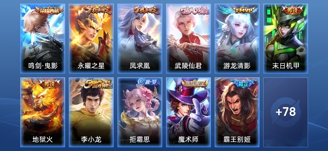 白起-白色死神,蘭陵王-隱刃,公孫離-花間舞,張飛-亂世虎臣,李元芳-特種部隊,魯班大師-歸虛夢演,女媧-尼羅河女神,劉邦-德古拉伯爵,王昭君-幻想奇妙夜,宮本武藏-霸王丸,關羽-天啟騎士,李信-灼熱之刃,裴擒虎-街頭旋風,呂布-野性能量,豬八戒-年年有餘,孫尚香-火炮千金,程咬金-星際陸戰隊,姬小滿-零食大作戰,老夫子-功夫老勺,李白-千年之狐,韓信-教廷特使,關羽-龍騰萬里,墨子-金屬風暴,蒙恬-秩序獵龍將,狂鐵-命運角鬥場,劉備-紐約教父,干將莫邪-第七人偶,諸葛亮-星航指揮官,花木蘭-水晶獵龍者,韓信-白龍吟,曜-歸虛夢演,劉禪-紳士熊喵,蘭陵王-暗隱獵獸者,百里守約-絕影神槍,達摩-拳王,楊戩-埃及法老,盾山-圓桌騎士,夏侯惇-乘風破浪,曹操-死神來了,狄仁傑-鷹眼統帥,劉邦-聖殿之光,成吉思汗-維京掠奪者,鍾無豔-海灘麗影,劉備-漢昭烈帝,劉禪-英喵野望,李白-範海辛,黃忠-芝加哥教父,扁鵲-化身博士,小喬-萬聖前夜,牛魔-制霸全明星,趙雲-忍·炎影,百里玄策-威尼斯狂歡,妲己-少女阿狸,東皇太一-東海龍王