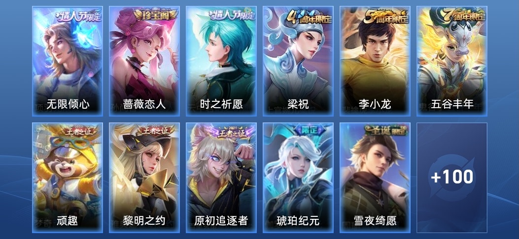 鬼谷子-五穀豐年,裴擒虎-李小龍,上官婉兒-梁祝,雲中君-時之祈願,百里玄策-原初追逐者,夢奇-頑趣,孫尚香-薔薇戀人,周瑜-雪夜綺願,伽羅-琥珀紀元,雅典娜-黎明之約