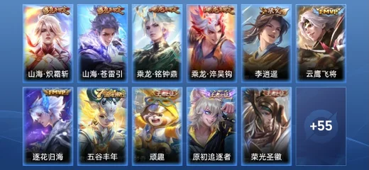 司馬懿-魘語軍師,后羿-精靈王,公孫離-花間舞,花木蘭-劍舞者,李元芳-特種部隊,豬八戒-潮玩探月行,鎧-曙光守護者,明世隱-虹雲星官,夢奇-美夢成真,嫦娥-露花倒影,哪吒-三太子,宮本武藏-霸王丸,廉頗-地獄巖魂,關羽-天啟騎士,達摩-大發明家,程咬金-無雙福將,高漸離-金屬狂潮,呂布-野性能量,張飛-五福同心,姜子牙-熾熱元素使,司空震-啟蟄,曹操-超能戰警,程咬金-星際陸戰隊,鬼谷子-幻樂之宴,亞瑟-死亡騎士,老夫子-功夫老勺,宮本武藏-永珍初新,孫悟空-西部大鏢客,韓信-教廷特使,關羽-龍騰萬里,馬可波羅-潮玩牛仔,雲中君-荷魯斯之眼,墨子-金屬風暴,蒙恬-秩序獵龍將,項羽-蒼穹之光,露娜-哥特玫瑰,劉備-紐約教父,魯班七號-電玩小子,張良-一千零一夜,楊戩-次元傲視,干將莫邪-第七人偶,王昭君-偶像歌手,貂蟬-異域舞娘,甄姬-冰雪圓舞曲,哪吒-次元突破,韓信-白龍吟,曜-歸虛夢演,妲己-魅力維加斯,孫臏-歸虛夢演,阿軻-愛心護理,伽羅-花見巫女,雅典娜-戰爭女神,張良-古海尋蹤,楊戩-埃及法老,孫尚香-沉穩之力,盾山-圓桌騎士,孫尚香-水果甜心,曹操-死神來了,鍾馗-地府判官,宮本武藏-鬼劍武藏,羋月-紅桃皇后,花木蘭-兔女郎,沈夢溪-鯊炮海盜貓,成吉思汗-維京掠奪者,廉頗-無盡征程,鍾無豔-海灘麗影,周瑜-海軍大將,狂鐵-特工戰影,劉禪-秘密基地,黃忠-芝加哥教父,蘇烈-堅韌之力,露娜-瓷語鑑心,扁鵲-化身博士,小喬-萬聖前夜,魯班七號-福祿兄弟,牛魔-制霸全明星,趙雲-忍·炎影,妲己-少女阿狸