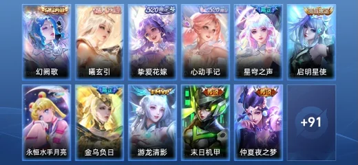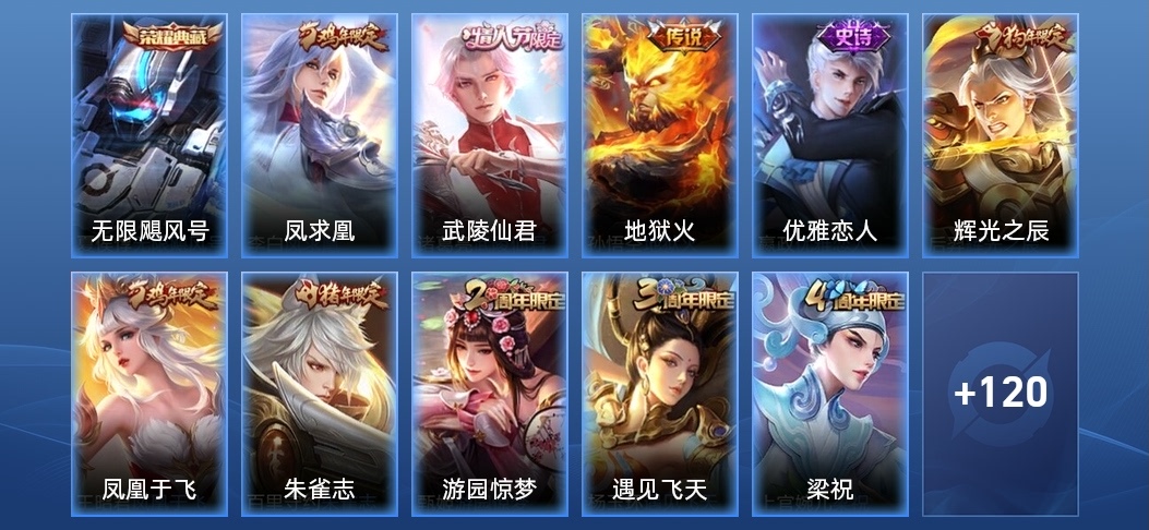后羿-輝光之辰,嬴政-優雅戀人,馬可波羅-暗影遊獵,裴擒虎-李小龍,王昭君-鳳凰于飛,元歌-雲間偶戲,夢奇-頑趣,甄姬-遊園驚夢,狄仁傑-魔術師,上官婉兒-梁祝,趙雲-皇家上將,百里玄策-原初追逐者,李元芳-銀河之約,楊玉環-遇見飛天,百里守約-朱雀志,雅典娜-黎明之約,莊周-高山流水