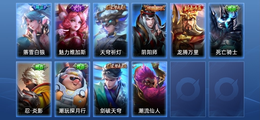 關羽-龍騰萬里,老夫子-潮流仙人,豬八戒-潮玩探月行,亞瑟-死亡騎士,妲己-魅力維加斯,趙雲-忍·炎影
