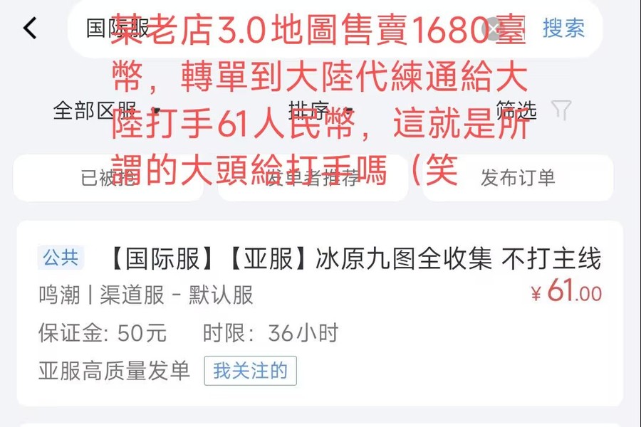 以友善積極良好的服務態度立本,消費過的買家都清楚誰在認真做事,歡迎老顧客和新顧客檢驗 我們不轉單給大陸和代練通和淘寶! 開服玩家+代打!不是嘴强和嘴硬的轉單賣場!不轉單給代練通,淘寶,我們代練全是自打,不需要預約打手,基本當天登錄開始,其他賣場所謂的預約打手就是發低價單,沒人接就慢慢等! 我的星穹鐵道賣場 我的絕區零賣場 我的尼姬賣場 我的賽馬娘賣場 -------------------------------------------- 深塔150 海墟150 ---------------------------------------- 3.0主綫+3.0地圖滿探索全收集+3.0全部限時活動打包1680(支持單獨購買+地圖都是滿探索全寶箱) 3.0主綫:300 三章第一幕:冰原下的星炬 三章第二幕:致第二次日出 3.0新地圖時9張滿探索全寶箱:990 3.0新活動限時内容全包:700(支持單獨購買活動) 開辟測界之路