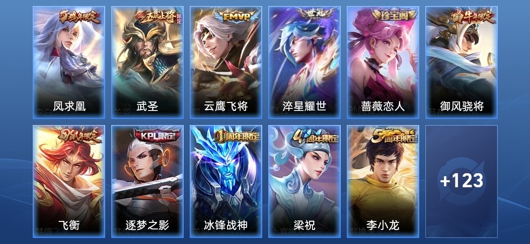 司馬懿-魘語軍師,劉禪-電玩·爆裂旋風,蘭陵王-隱刃,后羿-精靈王,張飛-亂世虎臣,鎧-曙光守護者,桑啟-畫中遊,王昭君-幻想奇妙夜,夢奇-美夢成真,馬超-倖存者,哪吒-三太子,宮本武藏-霸王丸,關羽-天啟騎士,李信-灼熱之刃,達摩-大發明家,裴擒虎-街頭旋風,鍾無豔-生化警戒,老夫子-潮流仙人,程咬金-星際陸戰隊,曹操-幽靈船長,亞瑟-死亡騎士,蒙犽-歸虛夢演,宮本武藏-永珍初新,孫悟空-西部大鏢客,李白-千年之狐,韓信-教廷特使,關羽-龍騰萬里,雲中君-荷魯斯之眼,蒙恬-秩序獵龍將,狂鐵-命運角鬥場,瀾-孤獵,露娜-哥特玫瑰,劉備-紐約教父,百里守約-特工魅影,張良-一千零一夜,楊戩-次元傲視,劉備-萬事如意,干將莫邪-第七人偶,貂蟬-異域舞娘,魯班大師-乓乓大師,韓信-街頭霸王,趙雲-白執事,馬可波羅-激情綠茵,花木蘭-水晶獵龍者,孫策-海之征途,曜-歸虛夢演,妲己-魅力維加斯,阿軻-愛心護理,伽羅-花見巫女,張良-繽紛繪卷,雅典娜-戰爭女神,百里守約-絕影神槍,達摩-拳王,典韋-黃金武士,孫尚香-沉穩之力,盾山-圓桌騎士,孫尚香-水果甜心,夏侯惇-乘風破浪,狄仁傑-鷹眼統帥,花木蘭-兔女郎,魯班七號-黑桃隊長,成吉思汗-維京掠奪者,鍾無豔-海灘麗影,廉頗-無盡征程,劉備-漢昭烈帝,諸葛亮-掌控之力,諸葛亮-黃金分割率,李白-範海辛,黃忠-芝加哥教父,蘇烈-堅韌之力,小喬-丁香結,鎧-龍域領主,蘇烈-愛與和平,魯班七號-福祿兄弟,趙雲-忍·炎影,百里玄策-威尼斯狂歡,妲己-少女阿狸,東皇太一-東海龍王,雲纓-赤焰之纓