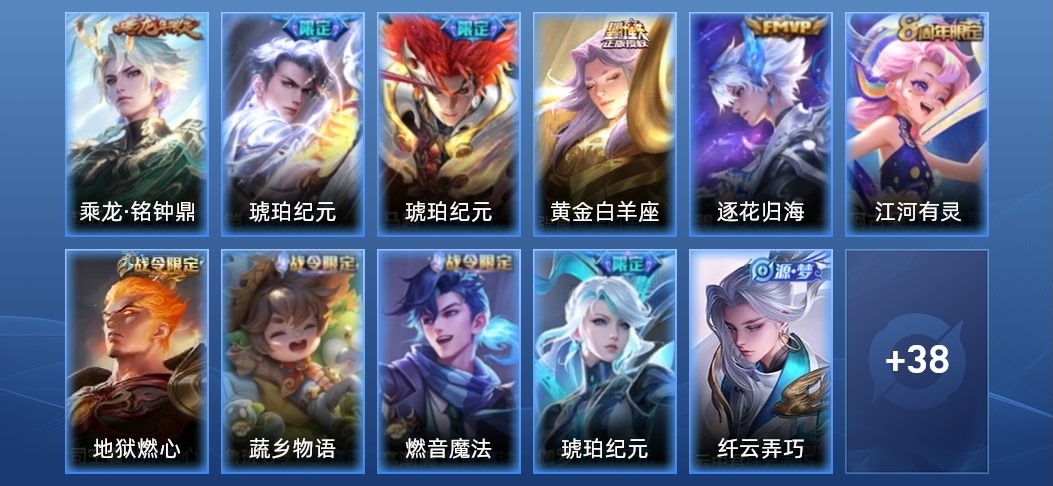 蔡文姬-薔薇王座,韓信-街頭霸王,張飛-亂世虎臣,李元芳-特種部隊,馬可波羅-激情綠茵,暃-碧珀緋影,妲己-魅力維加斯,蘭陵王-暗隱獵獸者,達摩-拳王,張良-古海尋蹤,鍾無豔-聚星閃耀,李信-灼熱之刃,狄仁傑-鷹眼統帥,鏡-冰刃幻境,夏侯惇-戰爭騎士,亞瑟-死亡騎士,狂鐵-特工戰影,老夫子-功夫老勺,孫悟空-西部大鏢客,韓信-教廷特使,阿軻-節奏熱浪,狂鐵-命運角鬥場,呂布-聖誕狂歡,鎧-龍域領主,趙雲-忍·炎影,王昭君-偶像歌手,艾琳-流音漫舞