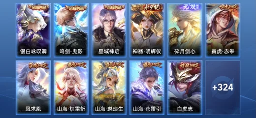 宮本武藏-永珍初新,亞連-破局者,鍾無豔-聚星閃耀,張良-古海尋蹤,明世隱-疑決卦,王昭君-午後時光,安琪拉-玩偶對對碰,曹操-燭龍,達摩-星際陸戰隊,姜子牙-熾熱元素使,孫臏-歸虛夢演,項羽-海灘派對,亞瑟-死亡騎士,魯班大師-探海日誌,沈夢溪-大漠名商,米萊狄-契約魔法,蒙恬-蔚藍守將,蒙犽-胡桃狂想曲,劉禪-喚靈魔甲,白起-夜都怪俠,阿軻-愛心護理,白起-白色死神,扁鵲-救世之瞳,扁鵲-化身博士,程咬金-演武奪籌,程咬金-無雙福將,達摩-大發明家,達摩-拳王,達摩-沙漠行僧,妲己-少女阿狸,妲己-紫羅蘭之誓,大喬-守護之力,狄仁傑-陰陽師,狄仁傑-萬華元夜,典韋-黃金武士,典韋-窮奇,盾山-御鑾,高漸離-死亡搖滾,宮本武藏-霸王丸,關羽-龍騰萬里,鬼谷子-幻樂之宴,鬼谷子-原初探秘者,韓信-街頭霸王,韓信-教廷特使,后羿-阿爾法小隊,后羿-聖弓遊俠,花木蘭-兔女郎,狂鐵-御獅,狂鐵-特工戰影,老夫子-功夫老勺,老夫子-醍醐杖,李白-敏銳之力,廉頗-無盡征程,劉邦-奪寶奇兵,劉邦-虎嘯劍宗,劉備-萬事如意,劉備-紐約教父,劉備-漢昭烈帝,劉禪-秘密基地,露娜-哥特玫瑰,魯班大師-乓乓大師,魯班七號-黑桃隊長,呂布-野性能量,米萊狄-御霄,羋月-重明,羋月-幻夜卜夢,明世隱-虹雲星官,墨子-神蹟守衛,哪吒-次元突破,牛魔-西部大鏢客,牛魔-制霸全明星,牛魔-御旌,盤古-重灌意志,沈夢溪-鯊炮海盜貓,沈夢溪-星空之諾,蘇烈-堅韌之力,蘇烈-千軍破陣,孫臏-天使之翼,孫尚香-沉穩之力,太乙真人-饕餮,太乙真人-華麗搖滾,王昭君-幻想奇妙夜,夏侯惇-朔風刀,小喬-丁香結,雅典娜-單詞大作戰,亞瑟-潮玩騎士王,楊戩-次元傲視,弈星-混沌棋,張飛-五福同心,張良-繽紛繪卷,趙雲-白執事,鍾無豔-海灘麗影,周瑜-赤蓮之焰,諸葛亮-掌控之力,莊周-奇妙博物學,狂鐵-命運角鬥場