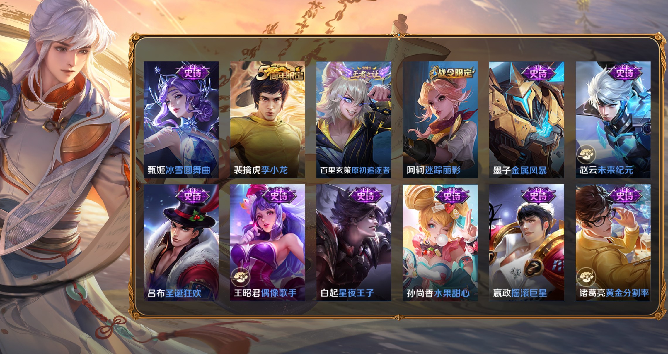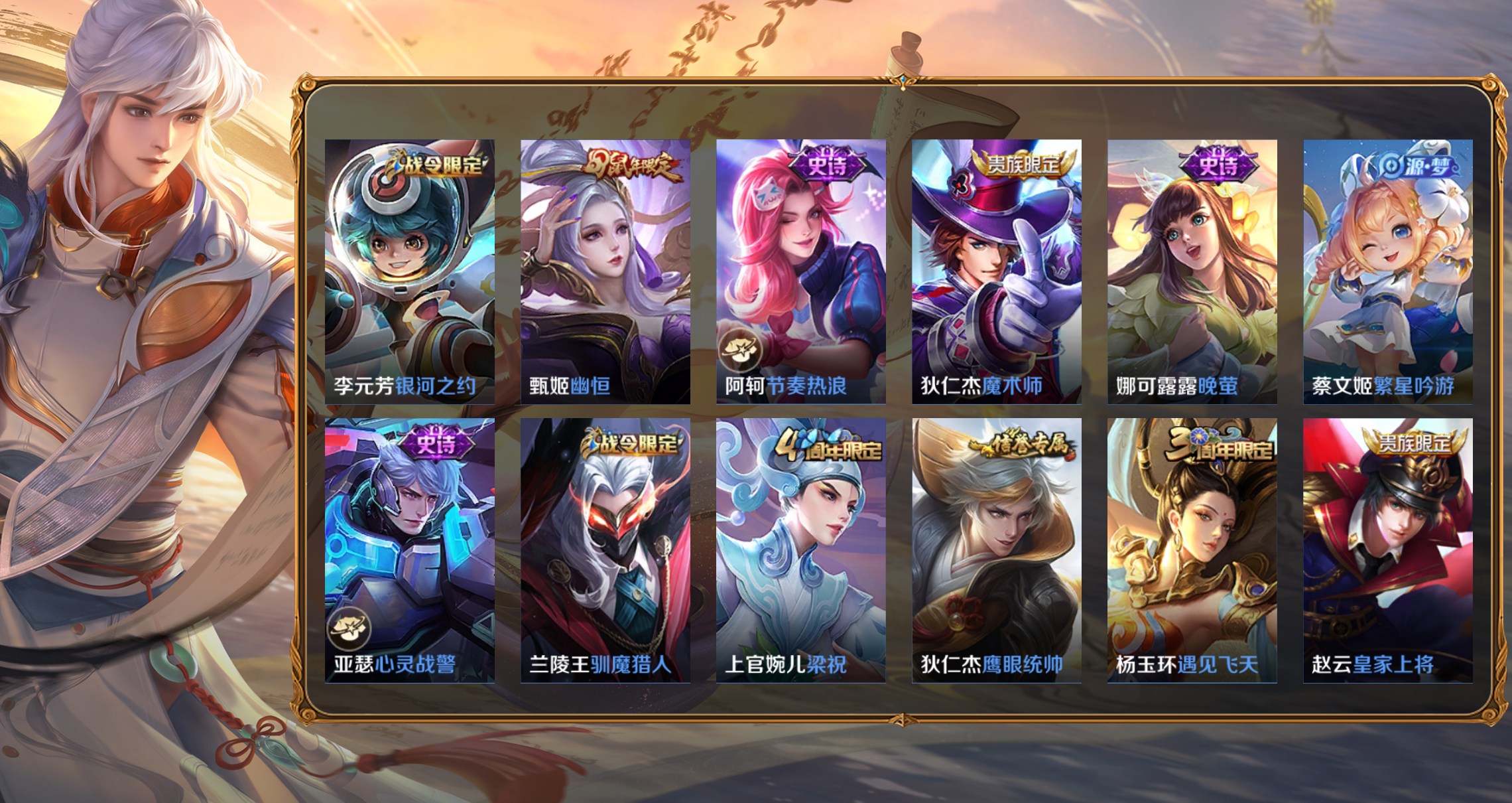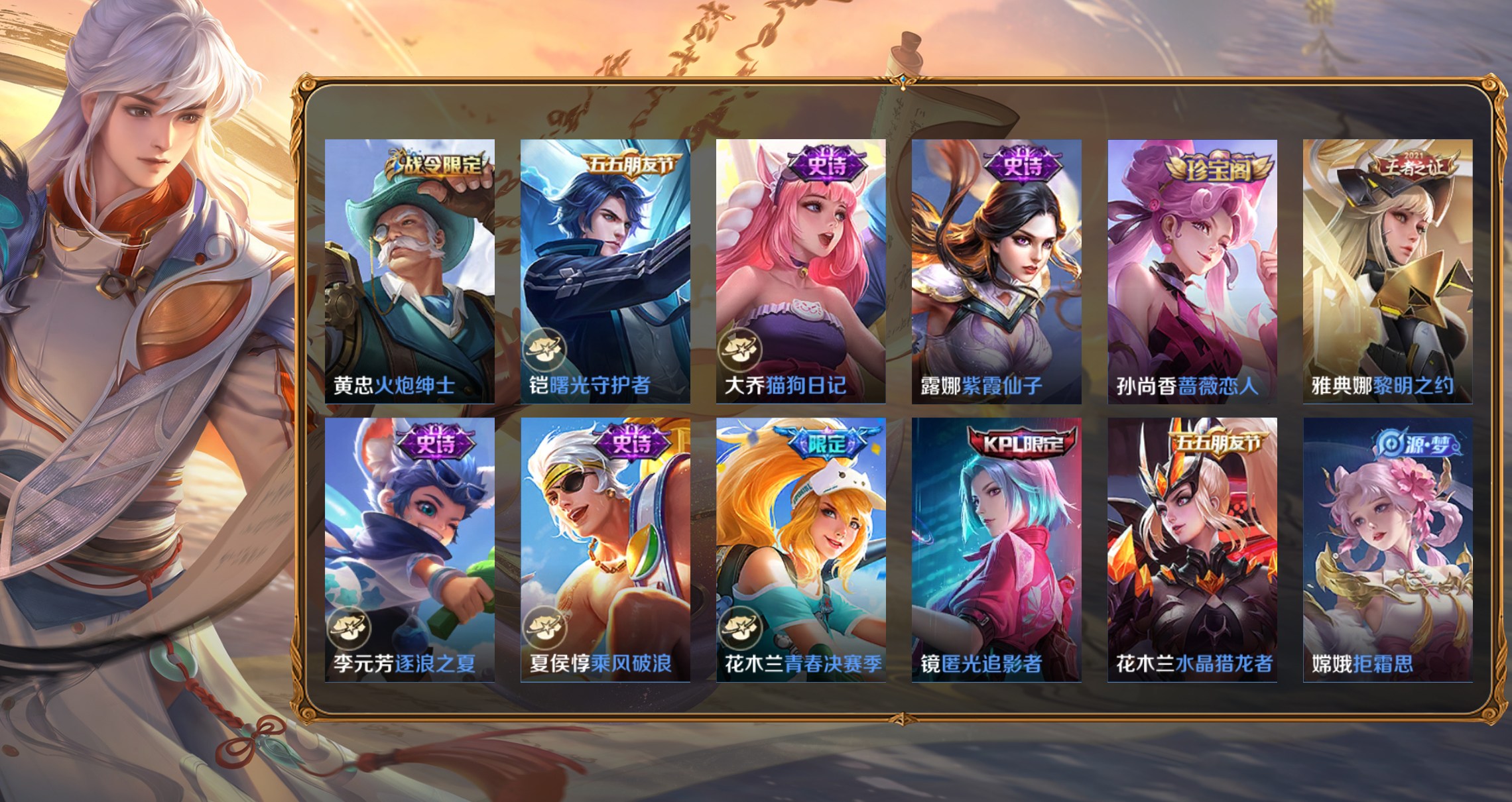 桑啟-畫中遊,阿古朵-熊喵少女,百里守約-絕影神槍,百里玄策-威尼斯狂歡,蔡文姬-薔薇王座,曹操-超能戰警,曹操-死神來了,嫦娥-露花倒影,成吉思汗-維京掠奪者,大喬-伊勢巫女,狄仁傑-錦衣衛,貂蟬-異域舞娘,東皇太一-東海龍王,伽羅-花見巫女,干將莫邪-第七人偶,高漸離-金屬狂潮,公孫離-花間舞,關羽-天啟騎士,鬼谷子-阿摩司公爵,后羿-精靈王,花木蘭-劍舞者,黃忠-芝加哥教父,金蟬-前塵,鏡-冰刃幻境,鎧-龍域領主,蘭陵王-隱刃,瀾-孤獵,老夫子-潮流仙人,李白-範海辛,李信-灼熱之刃,李元芳-特種部隊,劉禪-英喵野望,露娜-緋紅之刃,魯班大師-歸虛夢演,魯班七號-福祿兄弟,馬超-倖存者,馬可波羅-激情綠茵,蒙恬-秩序獵龍將,蒙犽-歸虛夢演,夢奇-美夢成真,明世隱-占星師,哪吒-三太子,女媧-尼羅河女神,盤古-創世神祝,裴擒虎-街頭旋風,上官婉兒-修竹墨客,沈夢溪-棒球奇才,司空震-啟蟄,司馬懿-魘語軍師,蘇烈-愛與和平,孫臏-未來旅行,孫策-海之征途,太乙真人-圓桌騎士,王昭君-精靈公主,西施-歸虛夢演,雅典娜-戰爭女神,楊戩-埃及法老,瑤-森,曜-歸虛夢演,虞姬-加勒比小姐,元歌-午夜歌劇院,雲纓-赤焰之纓,雲中君-荷魯斯之眼,張良-一千零一夜,鍾馗-地府判官,周瑜-海軍大將,豬八戒-年年有餘