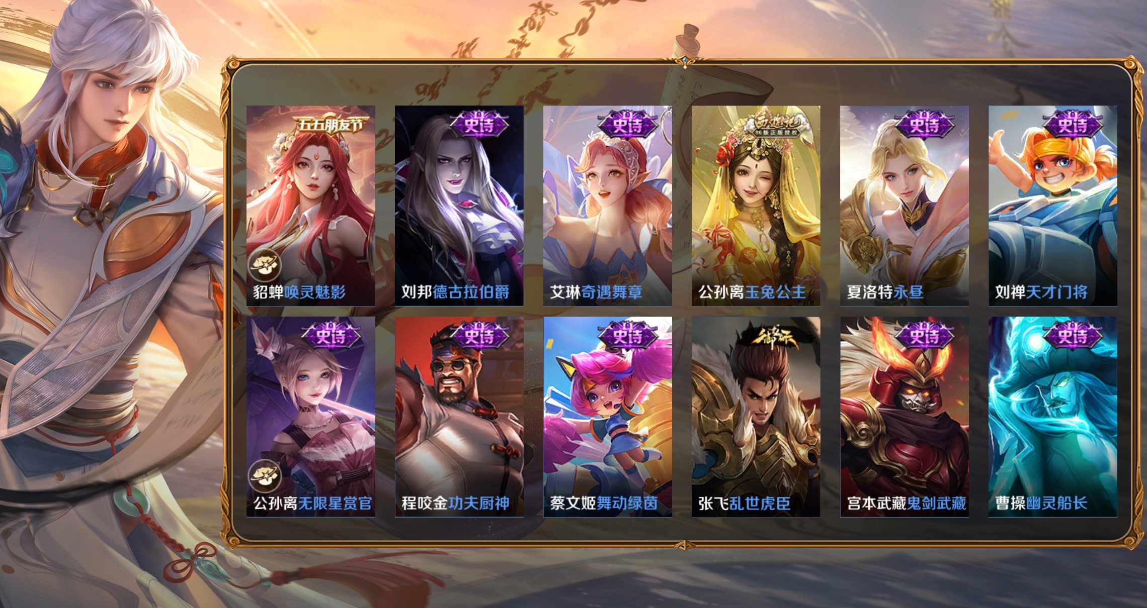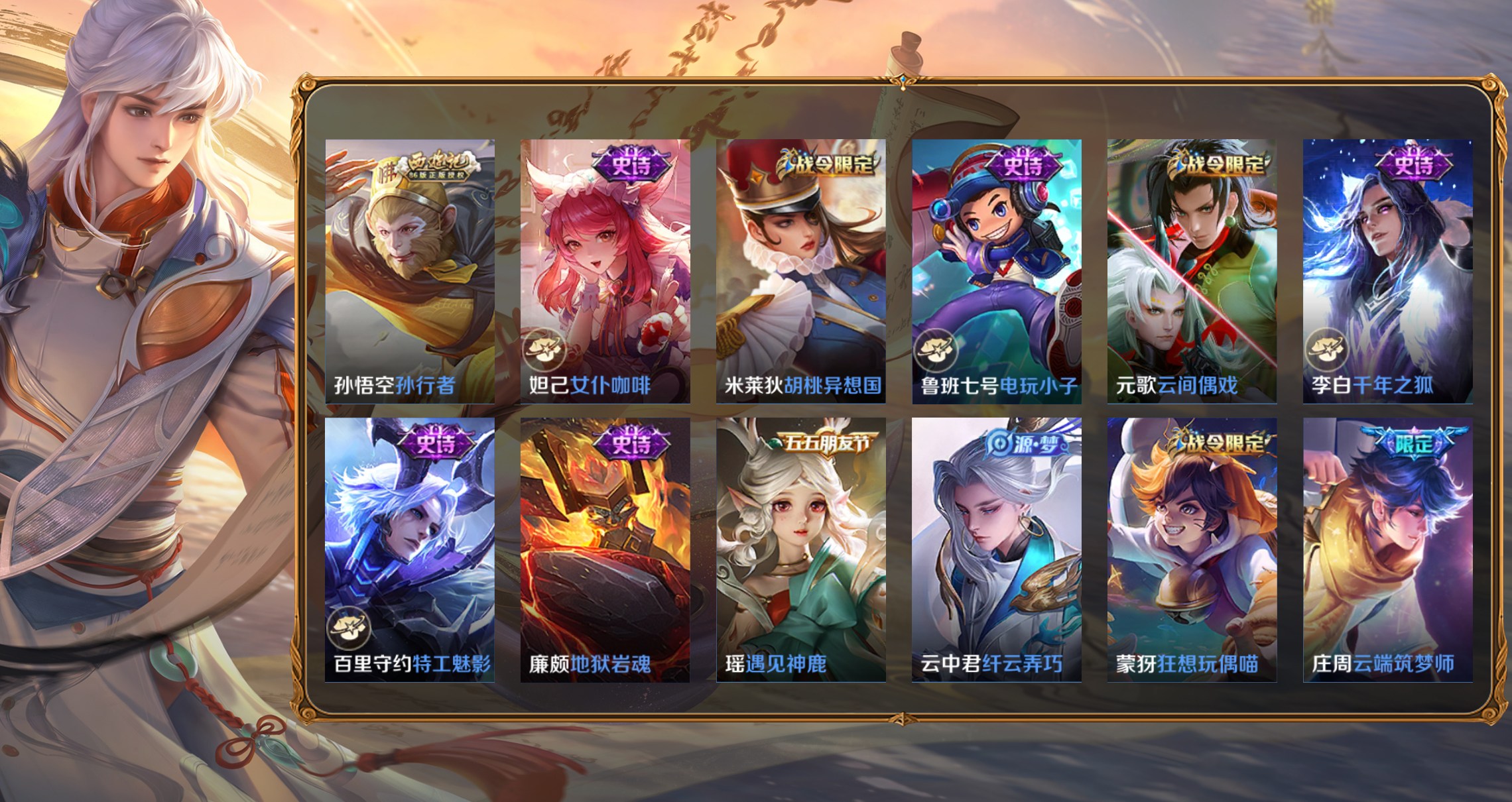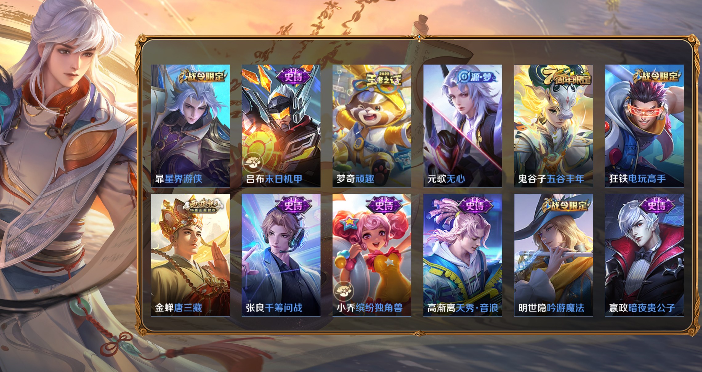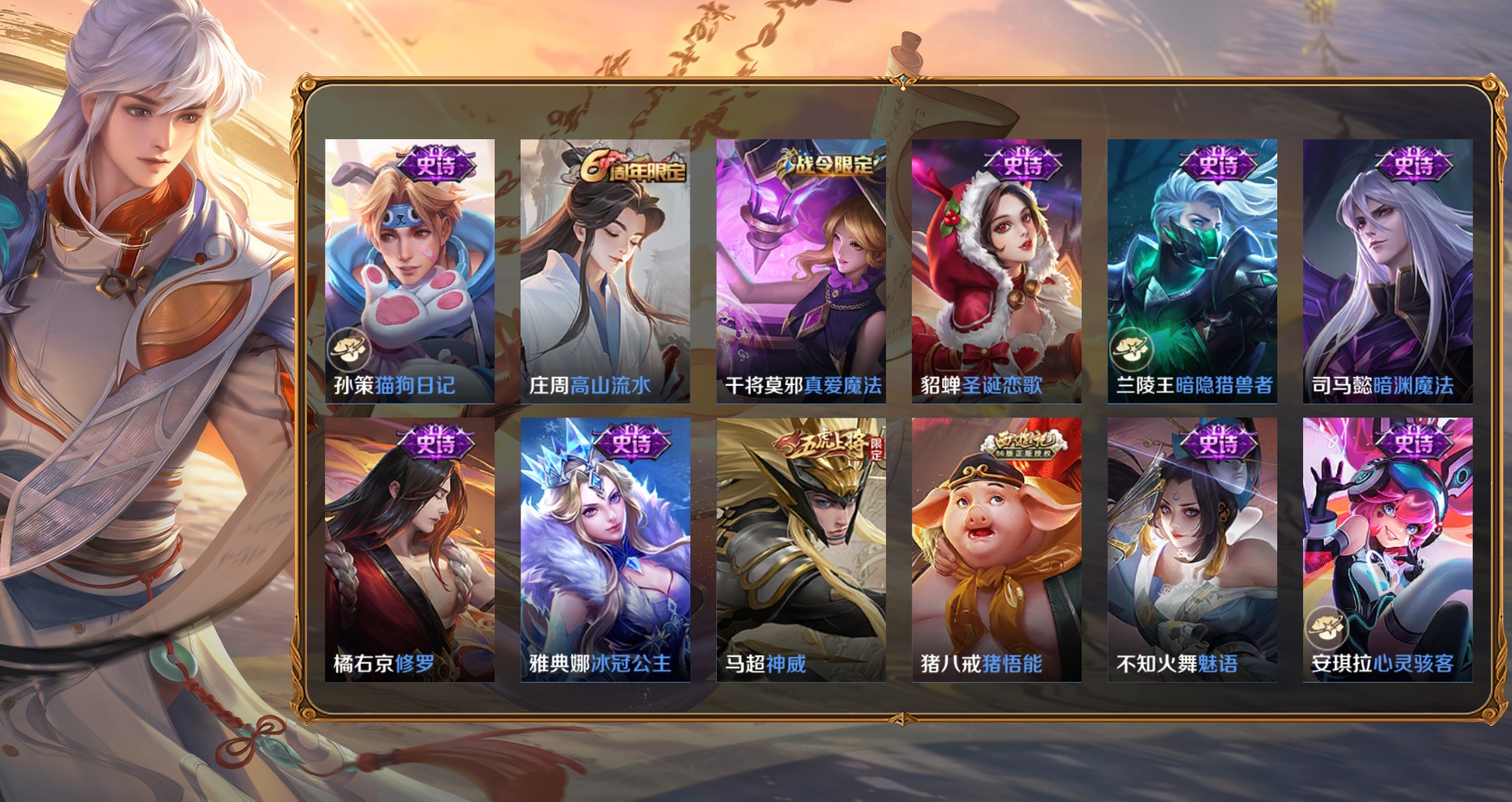 桑啟-畫中遊,阿古朵-熊喵少女,百里守約-絕影神槍,百里玄策-威尼斯狂歡,蔡文姬-薔薇王座,曹操-超能戰警,曹操-死神來了,嫦娥-露花倒影,成吉思汗-維京掠奪者,大喬-伊勢巫女,狄仁傑-錦衣衛,貂蟬-異域舞娘,東皇太一-東海龍王,伽羅-花見巫女,干將莫邪-第七人偶,高漸離-金屬狂潮,公孫離-花間舞,關羽-天啟騎士,鬼谷子-阿摩司公爵,后羿-精靈王,花木蘭-劍舞者,黃忠-芝加哥教父,金蟬-前塵,鏡-冰刃幻境,鎧-龍域領主,蘭陵王-隱刃,瀾-孤獵,老夫子-潮流仙人,李白-範海辛,李信-灼熱之刃,李元芳-特種部隊,劉禪-英喵野望,露娜-緋紅之刃,魯班大師-歸虛夢演,魯班七號-福祿兄弟,馬超-倖存者,馬可波羅-激情綠茵,蒙恬-秩序獵龍將,蒙犽-歸虛夢演,夢奇-美夢成真,明世隱-占星師,哪吒-三太子,女媧-尼羅河女神,盤古-創世神祝,裴擒虎-街頭旋風,上官婉兒-修竹墨客,沈夢溪-棒球奇才,司空震-啟蟄,司馬懿-魘語軍師,蘇烈-愛與和平,孫臏-未來旅行,孫策-海之征途,太乙真人-圓桌騎士,王昭君-精靈公主,西施-歸虛夢演,雅典娜-戰爭女神,楊戩-埃及法老,瑤-森,曜-歸虛夢演,虞姬-加勒比小姐,元歌-午夜歌劇院,雲纓-赤焰之纓,雲中君-荷魯斯之眼,張良-一千零一夜,鍾馗-地府判官,周瑜-海軍大將,豬八戒-年年有餘