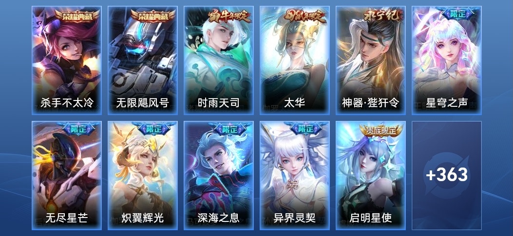典韋-藍色畫面警告,裴擒虎-李小龍,明世隱-吟遊魔法,鎧-青龍志,王昭君-鳳凰于飛,廉頗-寅虎·御盾,韓信-飛衡,嫦娥-拒霜思,米萊狄-胡桃異想國,趙雲-百木心槍,蘭陵王-馴魔獵人,魯班七號-蔬鄉物語,雲中君-時之祈願,百里玄策-原初追逐者,甄姬-幽恆,魯班七號-乒乒小將,蘇烈-玄武志,百里守約-朱雀志,伽羅-琥珀紀元,上官婉兒-神器·永珍筆,雲中君-纖雲弄巧,鬼谷子-五穀豐年,狂鐵-電玩高手,黃忠-烈魂,元歌-雲間偶戲,孫尚香-薔薇戀人,牛魔-奔雷神使,周瑜-雪夜綺願,鍾無豔-超時空戰士,蔡文姬-繁星吟遊,上官婉兒-梁祝,李元芳-銀河之約,魯班七號-獅舞東方,老夫子-航海奇遇記,雅典娜-黎明之約,高漸離-燃音魔法,上官婉兒-天狼繪夢者,甄姬-遊園驚夢,花木蘭-默契交鋒,呂布-御風驍將,狄仁傑-魔術師,阿軻-迷蹤麗影,楊玉環-遇見飛天,干將莫邪-真愛魔法,蒙犽-百解令,司空震-地獄燃心,蒙犽-狂想玩偶喵,后羿-輝光之辰,趙雲-引擎之心,馬可波羅-暗影遊獵,韓信-傲雪梅槍,典韋-岱宗,楊玉環-寅虎·心曲,羋月-白晶晶,安琪拉-魔法小廚娘,夢奇-頑趣,阿古朵-江河有靈,伽羅-天狼溯光者,干將莫邪-冰霜戀舞曲,甄姬-女兒國國王,妲己-時之彼端,趙雲-皇家上將,大喬-白鶴梁神女,嬴政-白晝王子,黃忠-火炮紳士,小喬-純白花嫁,莊周-高山流水