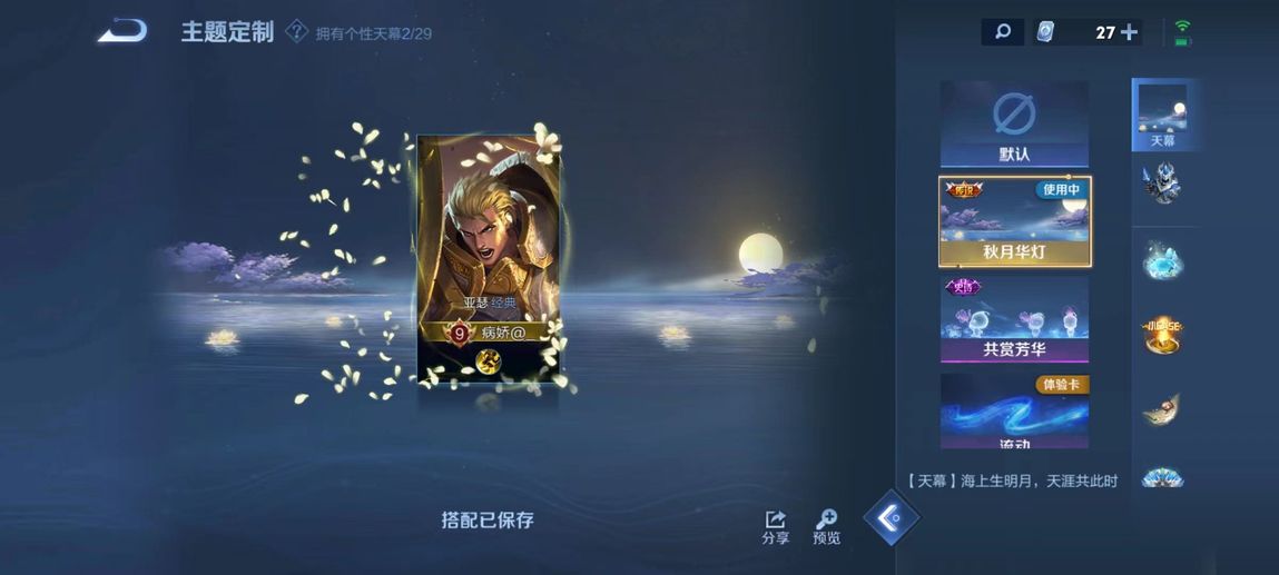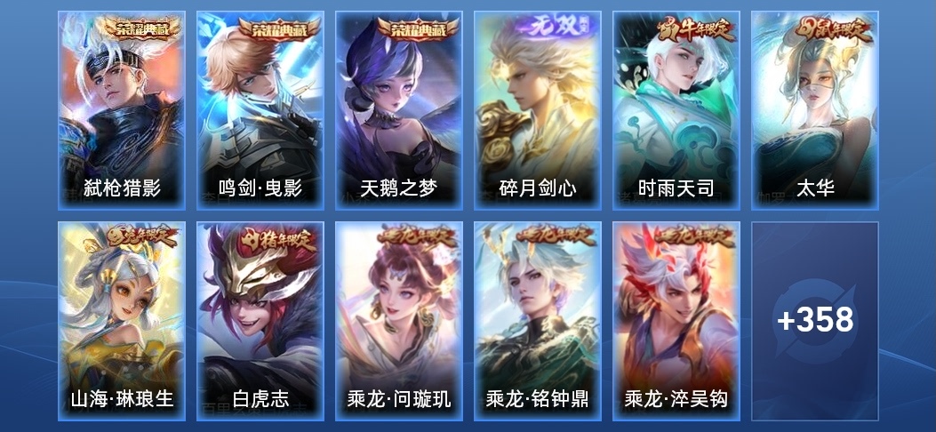 虞姬-啟明星使,呂布-曦玄引,諸葛亮-時雨天司,趙雲-乘龍·銘鐘鼎,亞連-落雪白狼,孫策-乘龍·淬吳鉤,孫尚香-乘龍·問璇璣,瑤-時之祈願,王昭君-星穹之聲,百里玄策-白虎志,小喬-山海·琳琅生,伽羅-太華,孫尚香-異界靈契