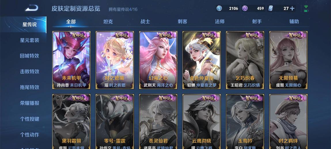裴擒虎-李小龍,明世隱-吟遊魔法,王昭君-鳳凰于飛,嫦娥-拒霜思,米萊狄-胡桃異想國,魯班七號-蔬鄉物語,雲中君-時之祈願,百里玄策-原初追逐者,戈婭-馭風魔法,伽羅-琥珀紀元,豬八戒-豬悟能,雲中君-纖雲弄巧,鬼谷子-五穀豐年,狂鐵-電玩高手,元歌-雲間偶戲,孫尚香-薔薇戀人,鍾無豔-超時空戰士,瑤-山海·碧波行,蔡文姬-繁星吟遊,元歌-無心,上官婉兒-梁祝,李元芳-銀河之約,夢奇-天降福星,暃-星界遊俠,魯班七號-獅舞東方,老夫子-航海奇遇記,雅典娜-黎明之約,嬴政-優雅戀人,鍾無豔-王者之錘,蒙恬-榮光聖徽,扁鵲-奇幻香蹤,高漸離-燃音魔法,上官婉兒-天狼繪夢者,甄姬-遊園驚夢,花木蘭-默契交鋒,狄仁傑-魔術師,阿軻-迷蹤麗影,孫悟空-孫行者,百里玄策-超元獵域,楊玉環-遇見飛天,干將莫邪-真愛魔法,蒙犽-百解令,司空震-地獄燃心,蒙犽-狂想玩偶喵,馬可波羅-暗影遊獵,羋月-白晶晶,大喬-乘龍·憶丹青,安琪拉-乘龍·聚寶船,夢奇-頑趣,阿古朵-江河有靈,干將莫邪-冰霜戀舞曲,趙雲-皇家上將,黃忠-火炮紳士,小喬-純白花嫁,莊周-高山流水