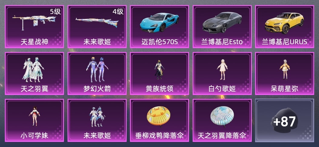 MG3-驚鴻俠骨,Kar98K-未來歌姬,野牛-電玩視界,Vector-金玉無雙,湯姆遜-耀粉歌者,Win94-瑞龍福將,湯姆遜-異彩先驅,M417-驚鴻俠骨,Vector-百合蜜語,S12K-瑞龍福將,莫辛納甘-懵萌河馬,Mk14-暗星紫秘,SKS-金玉無雙,GROZA-異彩先驅,S12K-焦糖拿鐵,Mini14-耀粉歌者,Kar98K-夢幻火箭,GROZA-懵萌河馬,PKM-天星戰神,DBS-甜心亞夢,SCAR-L-龍宮之主,QBZ-未來歌姬,Mk47-天之羽翼,MG3-瑞龍福將,M762-天星戰神,SKS-未來歌姬,M762-瑞龍福將,AWM-恐龍拽拽,UZI-金玉無雙,Kar98K-金玉無雙,AUG-耀粉歌者,蜜獾-垂柳戲鴨,MP5K-異彩先驅,AMR-白勺歌姬,DP-28-甜心亞夢,AA12-G-炫光之旅,SCAR-L-暗夜玫瑰,Mini14-異彩先驅,AKM-恐龍拽拽,PKM-夢幻舞會,Kar98K-洛神天依,Mk14-童趣迷兔,M200-驚鴻俠骨,Mini14-夢幻火箭,SKS-天之羽翼,G36C-懵萌河馬,PKM-懵萌河馬,TMP-9-未來歌姬