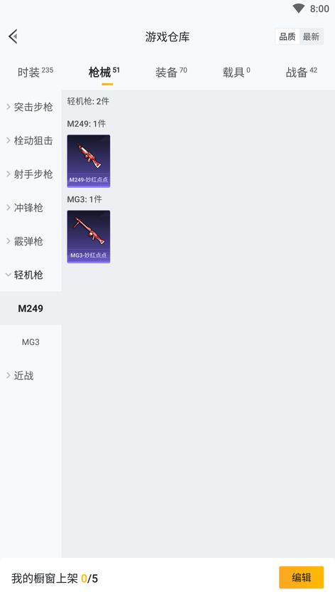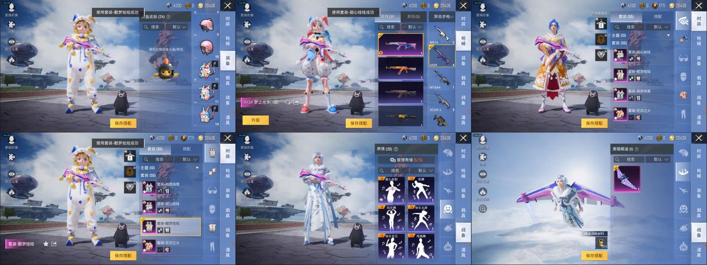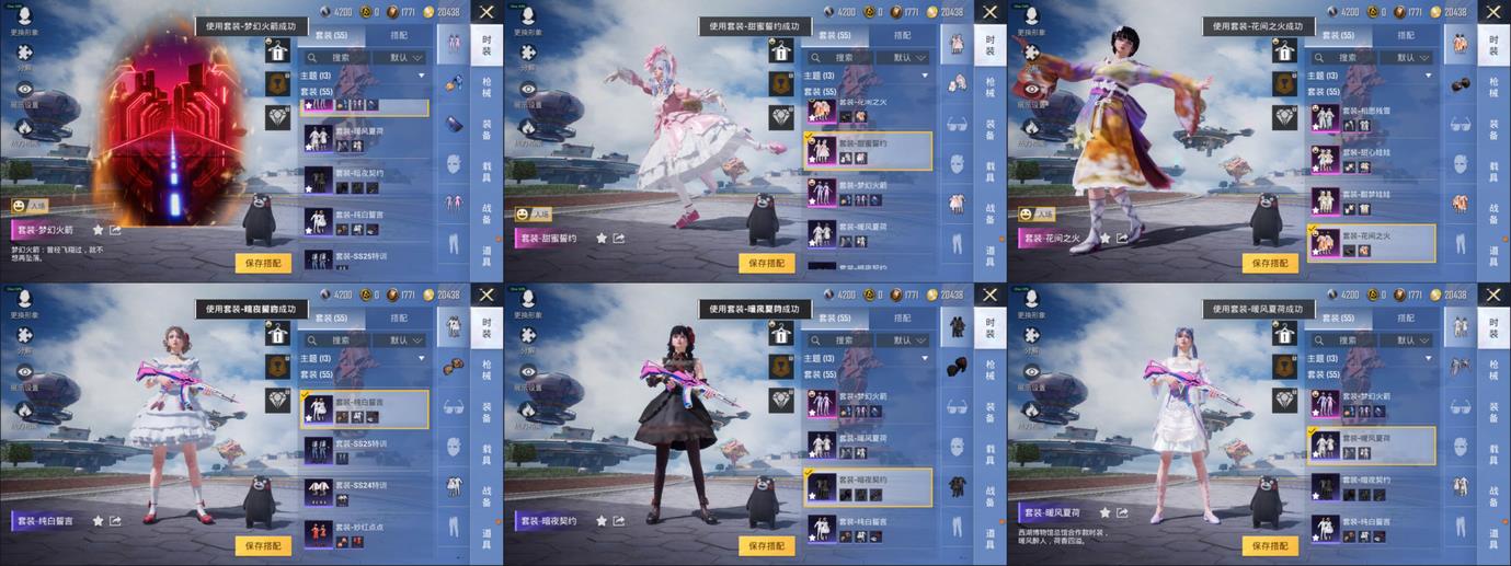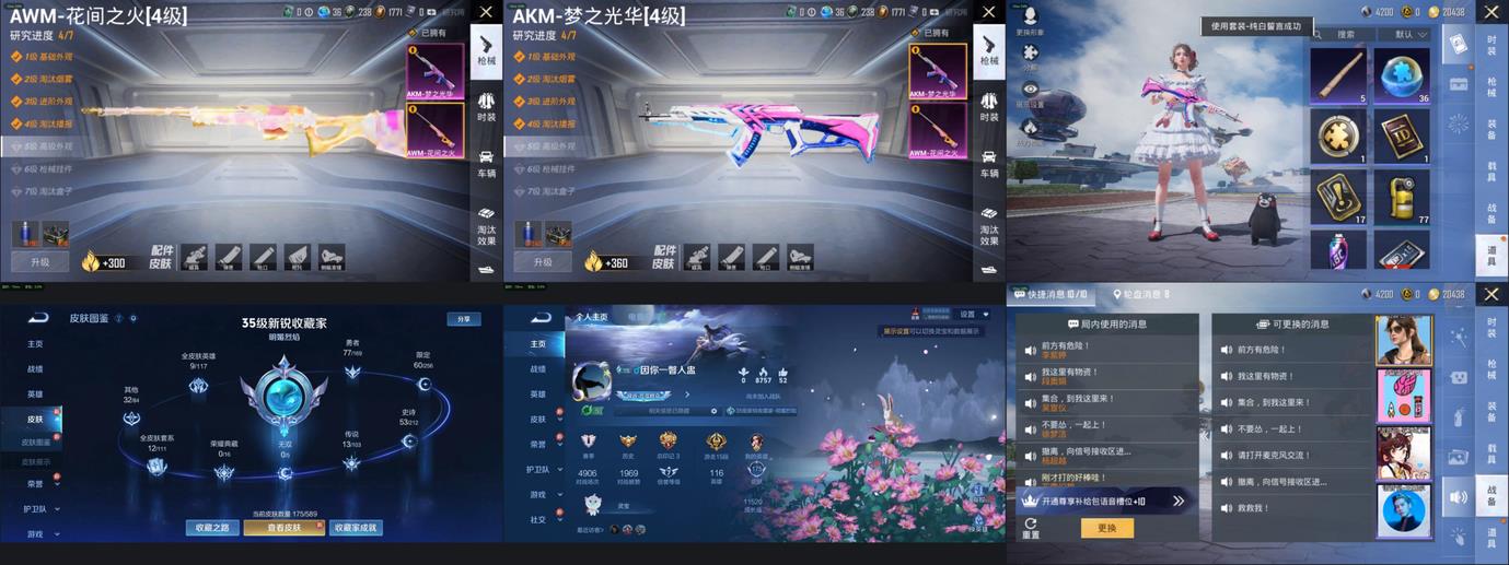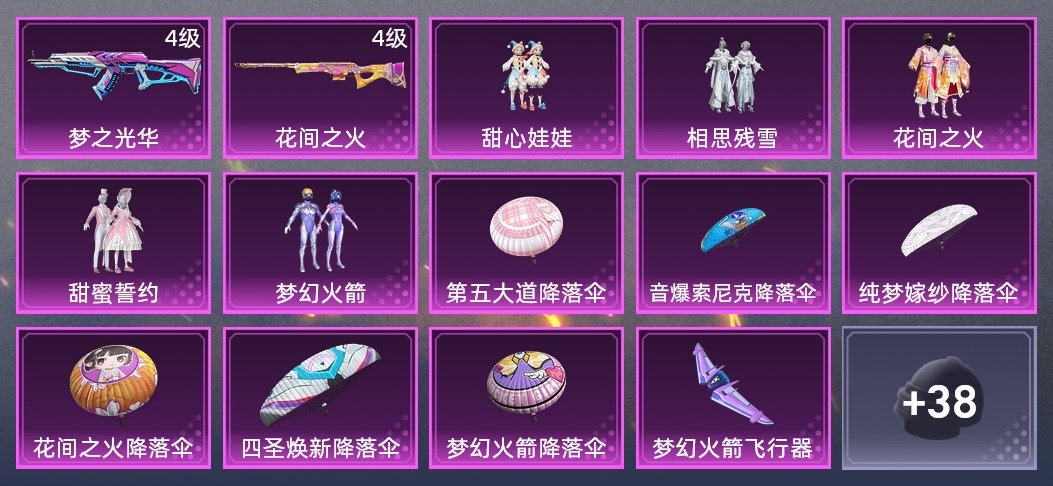 Win94-機械英豪,SKS-勇闖險境,MP5K-眾神之王,AMR-妙紅點點,MG3-妙紅點點,AUG-耀粉歌者,G36C-花間之火,湯姆遜-花間之火,AKM-夢之光華,AWM-花間之火,Mini14-甜心娃娃,S1897-暗夜鎏金,M249-妙紅點點,野牛-機械英豪,湯姆遜-勇闖險境,S1897-勇闖險境