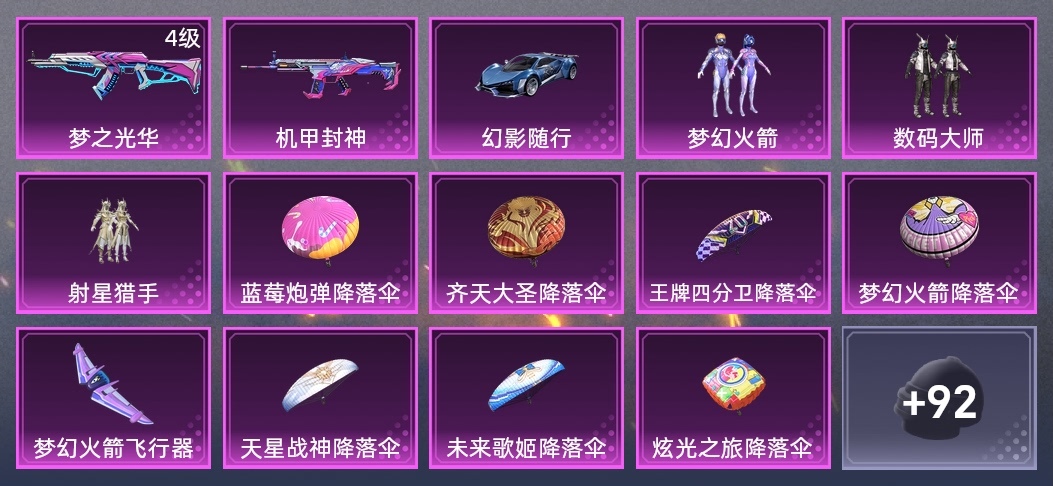 王牌四分衛降落傘,齊天大聖降落傘,天星戰神降落傘,夢幻火箭降落傘,炫光之旅降落傘,未來歌姬降落傘,藍莓炮彈降落傘,夢幻火箭飛行器