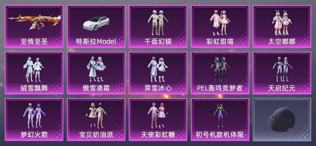 套裝-太空嘟嘟,套裝-千面幻鏡,套裝-PEL轟鳴競夢者,套裝-夢幻火箭,套裝-天使彩虹糖,套裝-傲雪凌霜,角色-初號機款機體服,套裝-天啟紀元,套裝-絨雪飄舞,套裝-霽雪冰心,套裝-寶貝奶油派,套裝-彩虹甜喵