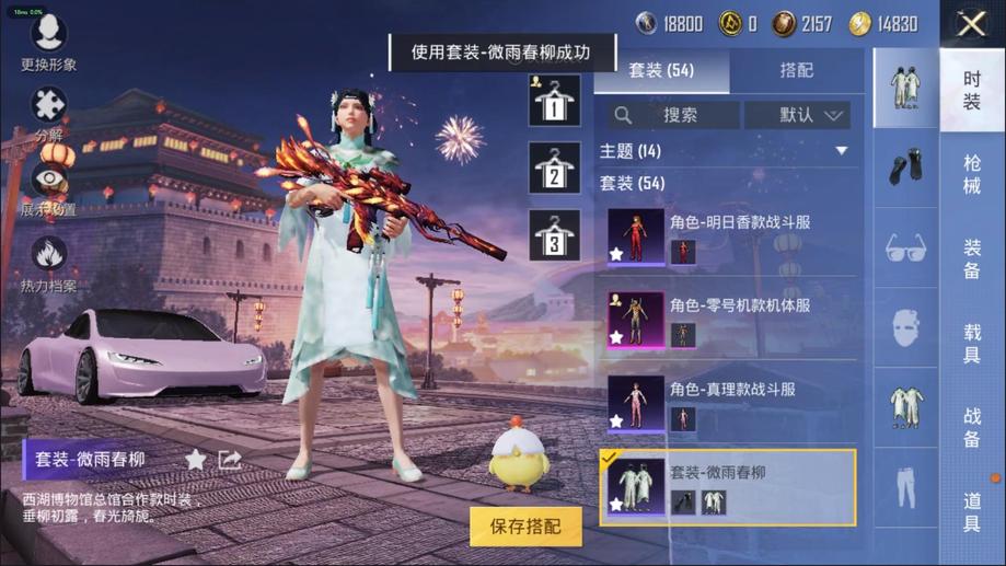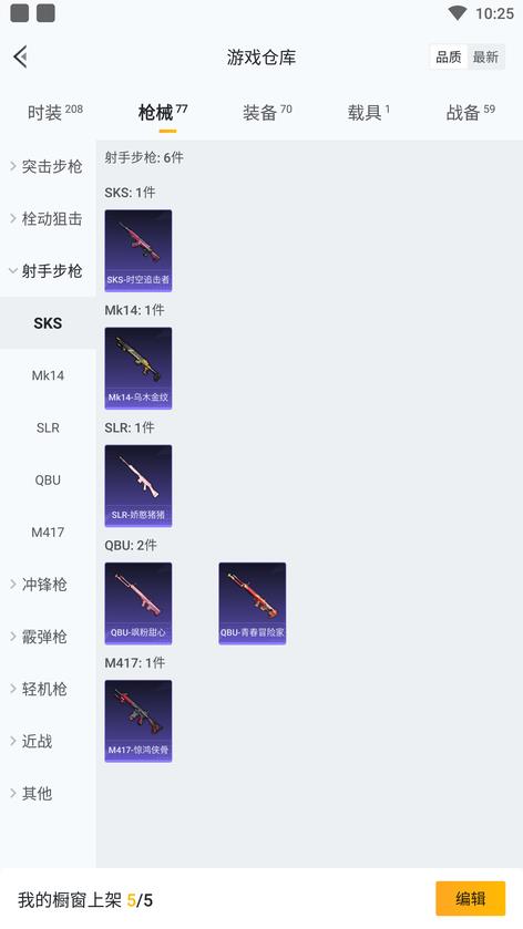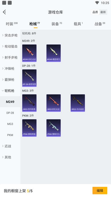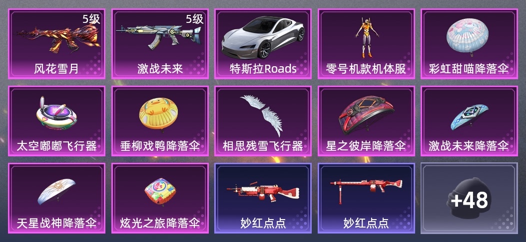 MG3-驚鴻俠骨,P90-甜蜜旋律,湯姆遜-耀粉歌者,DBS-時空追擊者,M762-激戰未來,AMR-妙紅點點,QBU-青春冒險家,MG3-妙紅點點,M417-驚鴻俠骨,SKS-時空追擊者,UZI-影襲,GROZA-黑色刀鋒,AUG-青春冒險家,DP-28-相思殘雪,M416-風花雪月,S12K-垂柳戲鴨,野牛-青春冒險家,M249-妙紅點點,PKM-拂曉神騎,M200-驚鴻俠骨,AKM-萌趣顏糰子,QBU-颯粉甜心,M24-拂曉神騎
