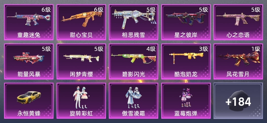 AUG-閒夢青纓,SPAS-12-田園牧歌,S686-白勺歌姬,AWM-垂柳戲鴨,AC-VAL-甜心亞夢,S1897-星夜魔法師,AUG-青春冒險家,GROZA-異彩先驅,GROZA-懵萌河馬,Kar98K-影襲,AUG-星之彼岸,Kar98K-2B戰鬥服款,DBS-甜心亞夢,AC-VAL-快閃甜心,蜜獾-嬌憨豬豬,AMR-白勺歌姬,DP-28-旋轉彩虹,MK20-H-快閃甜心,UMP45-相思殘雪,AKM-萌趣顏糰子,AKM-影襲,UZI-嬌憨豬豬,Mk47-青春冒險家,Win94-瑞龍福將,Mk14-閒夢青纓,M417-驚鴻俠骨,SCAR-L-童趣迷兔,UZI-烈焰拳霸,Mk14-治癒之星,GROZA-田園牧歌,S12K-嬌憨豬豬,DBS-第五大道,M249-星之彼岸,GROZA-影襲,MG3-瑞龍福將,S1897-飛馳魅影,S1897-百萬伏特,蠍式手槍-閒夢青纓,Kar98K-飛馳魅影,AUG-聖光天使,MP5K-異彩先驅,S12K-垂柳戲鴨,VSS-田園牧歌,M200-驚鴻俠骨,G36C-懵萌河馬,PKM-懵萌河馬,MG3-驚鴻俠骨,S12K-瑞龍福將,Mini14-耀粉歌者,Kar98K-夢幻火箭,M24-治癒之星,M416-心之戀語,SLR-嬌憨豬豬,M416-暗夜行者,M249-妙紅點點,P90-飛馳魅影,AKM-甜心寶貝,AWM-莊周夢蝶,M762-瑞龍福將,AMR-妙紅點點,S12K-童趣迷兔,UZI-影襲,DP-28-甜心亞夢,M16A4-甜心亞夢,P90-快閃甜心,Kar98K-紅傘翩翩,Mini14-異彩先驅,MK20-H-蓮影清波,野牛-青春冒險家,SKS-碧影閃光,QBZ-相思殘雪,GROZA-治癒之星,湯姆遜-異彩先驅,MG3-妙紅點點,UMP45-海淵國主,M249-月影鴛鴦,MG3-暗夜行者,莫辛納甘-懵萌河馬,QBU-烈焰拳霸,Vector-治癒之星,SKS-金玉無雙,M24-影襲,Vector-田園牧歌,SCAR-L-龍宮之主,P90-能量風暴,QBU-青春冒險家,AKM-星之彼岸,蜜獾-垂柳戲鴨,AKM-築夢精靈,M416-風花雪月,AKM-百萬伏特,P90-築夢精靈,Mk47-妙紅點點,AC-VAL-閒夢青纓,Mk14-童趣迷兔,GROZA-2B戰鬥服款,VSS-星之彼岸,MG3-酷泡奶龍,Mini14-夢幻火箭,QBZ-飛馳魅影