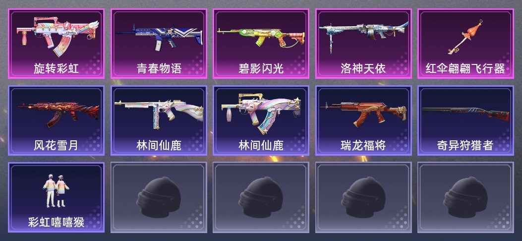 S686-奇異狩獵者,GROZA-林間仙鹿,M762-瑞龍福將,SKS-碧影閃光,MG3-洛神天依,GROZA-旋轉彩虹,SCAR-L-青春物語,M762-風花雪月,湯姆遜-林間仙鹿