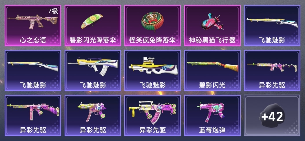 S1897-神秘黑貓,Win94-瑞龍福將,湯姆遜-異彩先驅,M249-古堡領主,S12K-瑞龍福將,G36C-暗夜玫瑰,S1897-碧影閃光,GROZA-異彩先驅,QBU-不夜海上花,M416-心之戀語,Mini14-穿刺龍蝦,M249-星之彼岸,P90-飛馳魅影,MP5K-藍莓炮彈,S686-不夜海上花,MG3-瑞龍福將,S1897-飛馳魅影,M762-瑞龍福將,QBZ-神秘黑貓,UZI-影襲,Kar98K-飛馳魅影,AWM-不夜海上花,MP5K-異彩先驅,Mk47-洛神天依,SCAR-L-暗夜玫瑰,Mini14-異彩先驅,AKM-萌趣顏糰子,QBZ-飛馳魅影