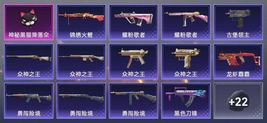 SKS-勇闖險境,MP5K-眾神之王,湯姆遜-耀粉歌者,S686-魔法學院,M24-眾神之王,GROZA-黑色刀鋒,AUG-耀粉歌者,DP-28-錦繡火鯉,M16A4-凝視深淵,VSS-黑色刀鋒,Vector-龍蝦霸霸,UZI-眾神之王,湯姆遜-幻影戰神,UZI-古堡領主,SLR-眾神之王,M762-詭娃娃,湯姆遜-勇闖險境,Vector-黑色刀鋒,S1897-勇闖險境