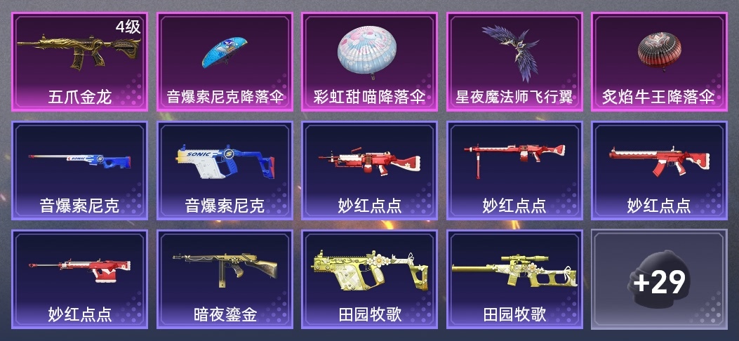 UZI-嬌憨豬豬,SPAS-12-田園牧歌,Vector-音爆索尼克,湯姆遜-耀粉歌者,M416-五爪金龍,AMR-妙紅點點,MG3-妙紅點點,AC-VAL-甜心亞夢,AWM-音爆索尼克,AUG-耀粉歌者,蜜獾-嬌憨豬豬,Vector-田園牧歌,DP-28-甜心亞夢,GROZA-田園牧歌,M16A4-甜心亞夢,S12K-嬌憨豬豬,VSS-田園牧歌,SLR-嬌憨豬豬,Mk47-妙紅點點,莫辛納甘-炙焰牛王,湯姆遜-暗夜鎏金,M249-妙紅點點,AC-VAL-彩虹甜喵,DBS-甜心亞夢