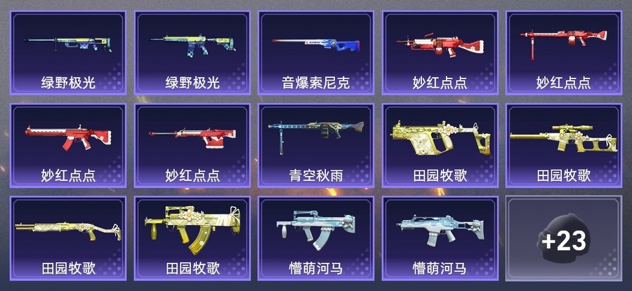 MG3-驚鴻俠骨,SPAS-12-田園牧歌,MG3-青空秋雨,AMR-妙紅點點,MG3-妙紅點點,M417-驚鴻俠骨,AWM-音爆索尼克,莫辛納甘-懵萌河馬,Vector-田園牧歌,GROZA-田園牧歌,GROZA-懵萌河馬,M416-綠野極光,M200-綠野極光,VSS-田園牧歌,Mk47-妙紅點點,M249-妙紅點點,M200-驚鴻俠骨,G36C-懵萌河馬,PKM-懵萌河馬