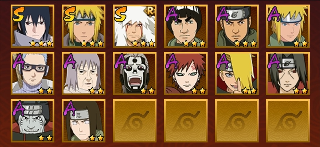 忍戰寧次,舞之豪傑自來也,六代水影,阿斯瑪,鼬,鬼鮫,凱,青年水門,永恆萬花筒佐助,水門,迪達拉,疾風傳我愛羅,死司飛段,近松十人衛千代