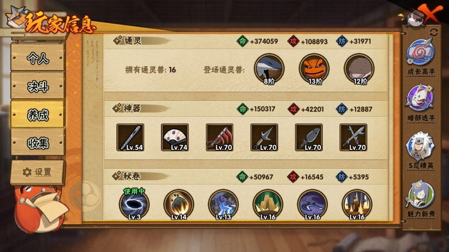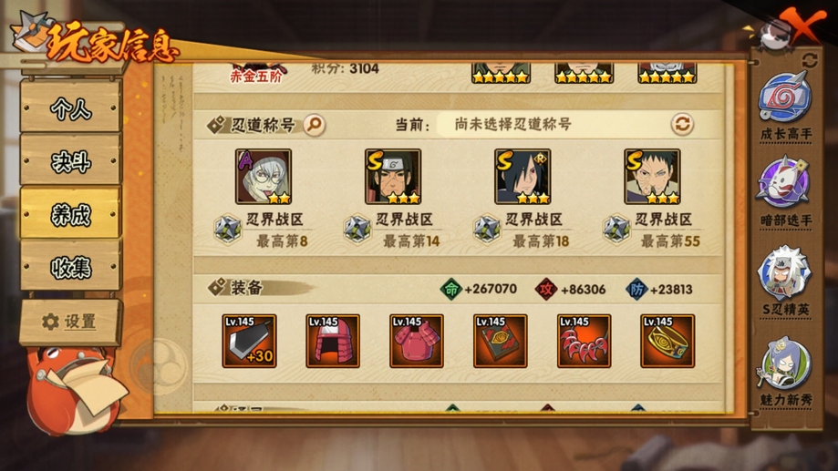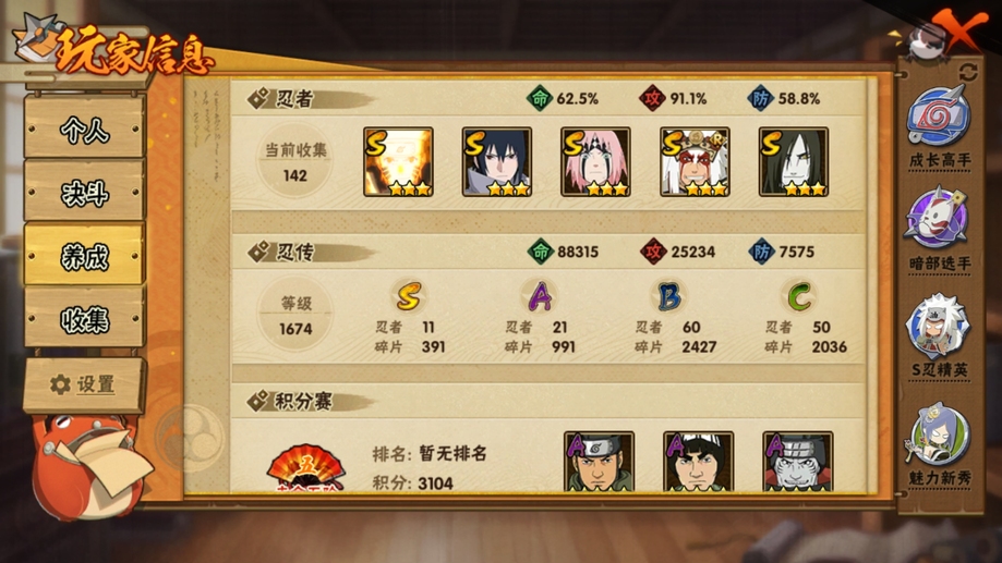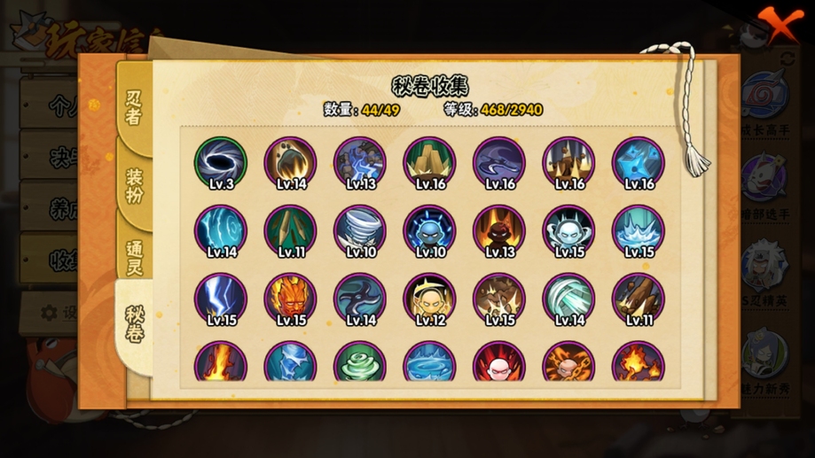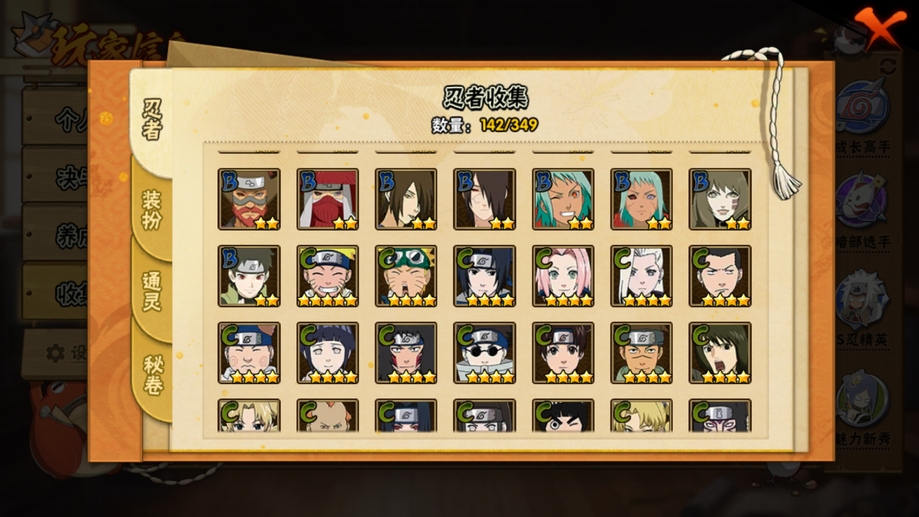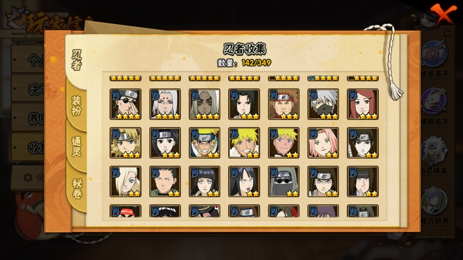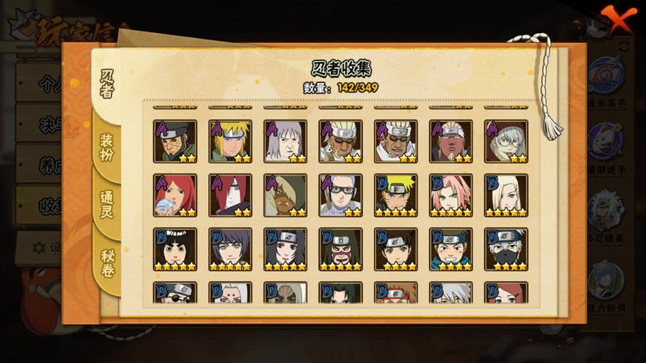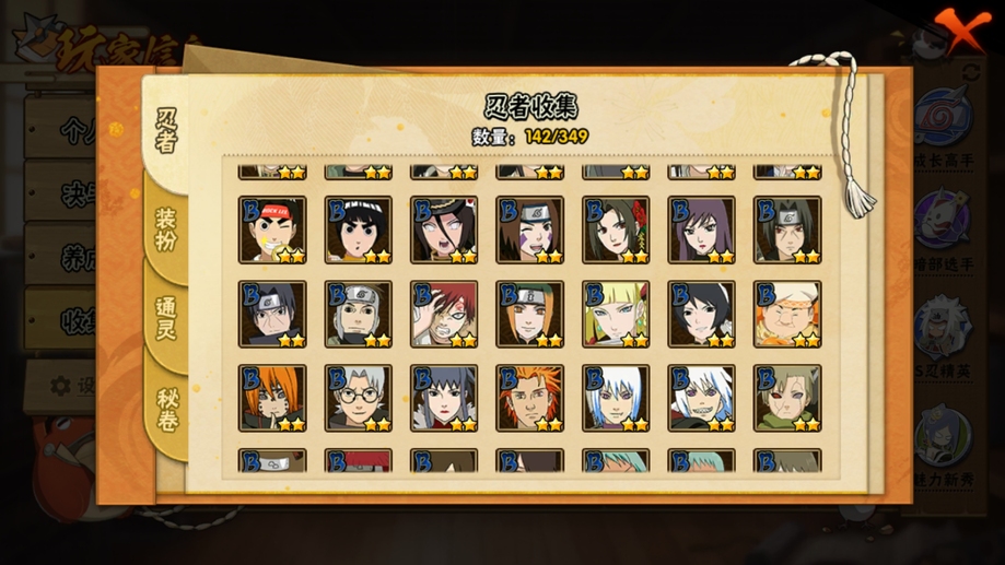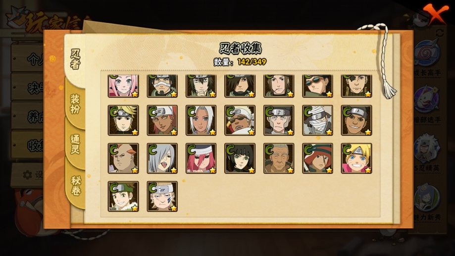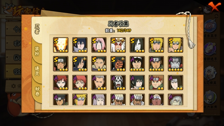 創立斑,飛段,舞之豪傑自來也,阿斯瑪,鬼鮫,須佐佐助,蠍,斗篷兜,忍戰奇拉比,永恆萬花筒佐助,忍戰櫻,青年長門,紅夜帶土,死司飛段,青年艾,忍戰寧次,大蛇丸,奇拉比,六代水影,不風,忍戰帶土,穢土柱間,穢土阿斯瑪,忍戰丁次,凱,青年水門,九喇嘛鳴人,水門,博人傳達魯伊,疾風傳我愛羅,穢土水門,近松十人衛千代