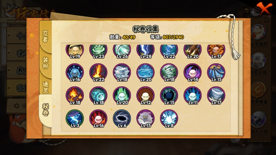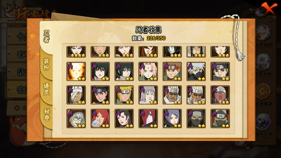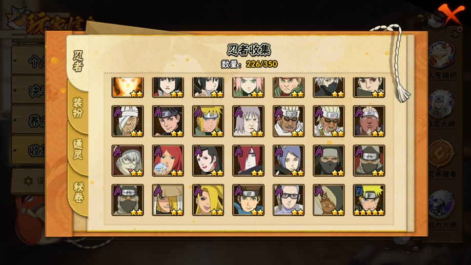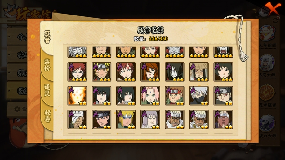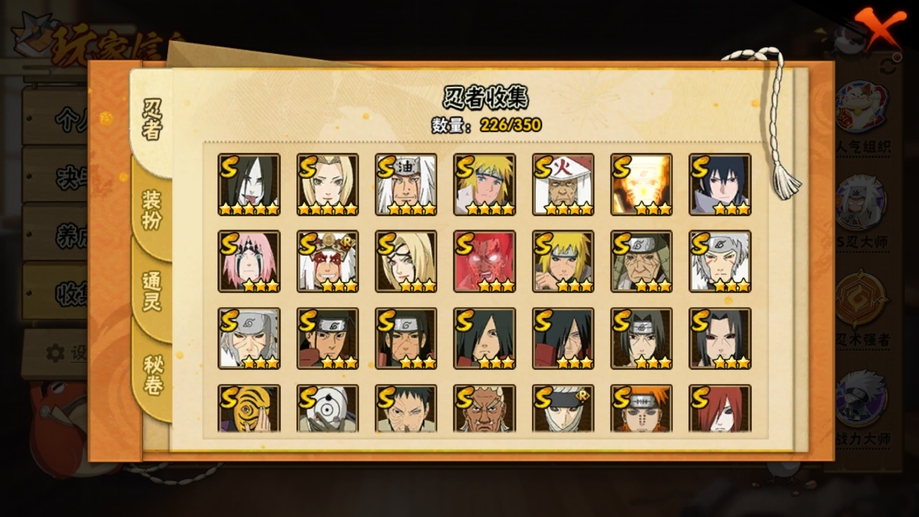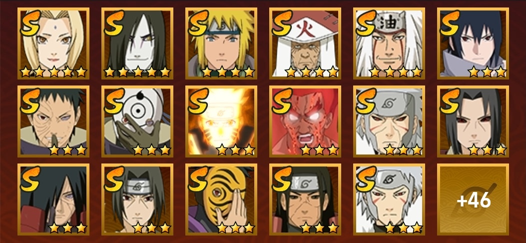 飛段,舞之豪傑自來也,阿斯瑪,斗篷兜,斑,忍戰奇拉比,青年長門,死司飛段,止水,青年艾,五代水影,不緣,小南,萬花筒卡卡西,團藏,曉創生角都,仙人鳴人,鼬,萬花筒佐助,穢土柱間,柱間,二代土影,青年水門,九尾鳴人,九喇嘛鳴人,水門,疾風傳我愛羅,穢土水門,近松十人衛千代,天道,穢土長門,扉間,穢土扉間,仙人兜,百豪櫻,鬼鮫,須佐佐助,蠍,三代火影,須佐鼬,永恆萬花筒佐助,忍戰櫻,綱手,穢土斑,忍戰我愛羅,白面具,穢土日斬,神秘面具男,大蛇丸,死門凱,曉大蛇丸,奇拉比,不風,忍戰帶土,忍戰丁次,凱,自來也,四代雷影,博人傳黑土,角都,百豪綱手,青年日斬,穢土鼬