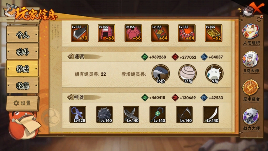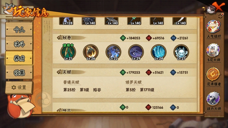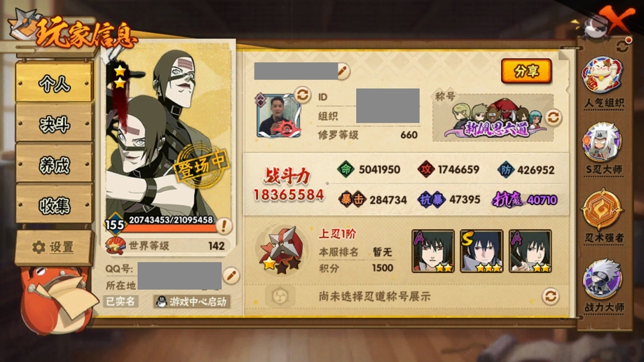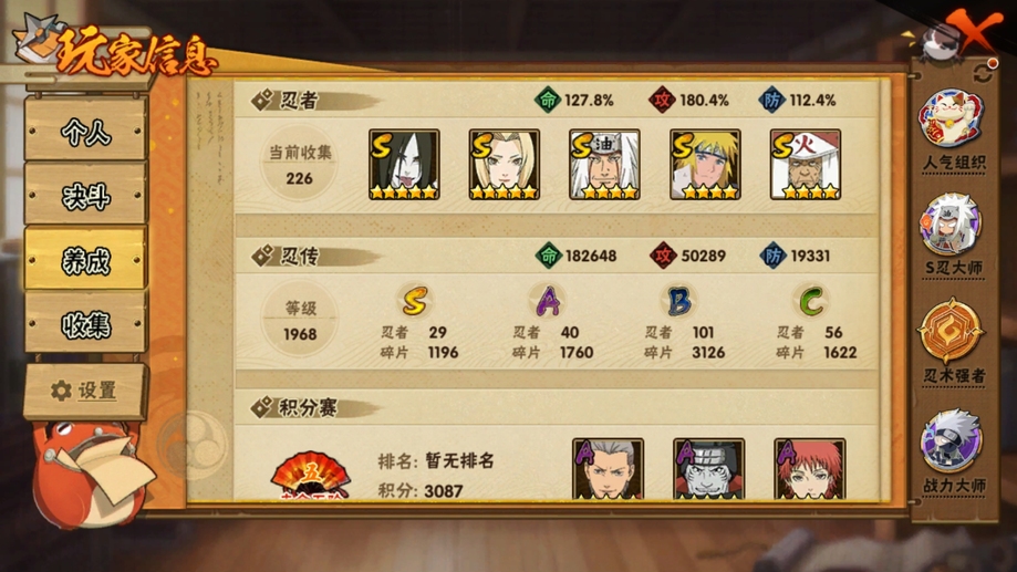 還差幾十片四個五星 S 忍,號裡高招還有一萬多金幣,王者榮耀也是元老號