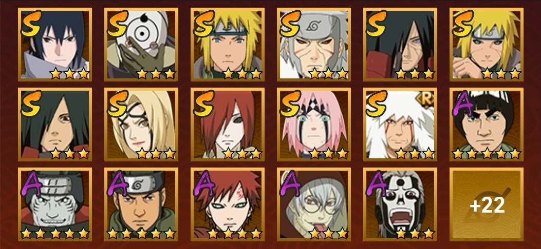 飛段,舞之豪傑自來也,穢土長門,泳裝小南,穢土扉間,百豪櫻,阿斯瑪,鬼鮫,須佐佐助,蠍,斗篷兜,博人傳木葉丸,斑,青年長門,永恆萬花筒佐助,忍戰櫻,忍戰我愛羅,迪達拉,穢土斑,白面具,死司飛段,五代水影,穢土迪達拉,萬花筒卡卡西,團藏,曉大蛇丸,六代水影,仙人鳴人,萬花筒佐助,鼬,新春水門,凱,九尾鳴人,水門,疾風傳我愛羅,青年日斬,百豪綱手,穢土水門,近松十人衛千代