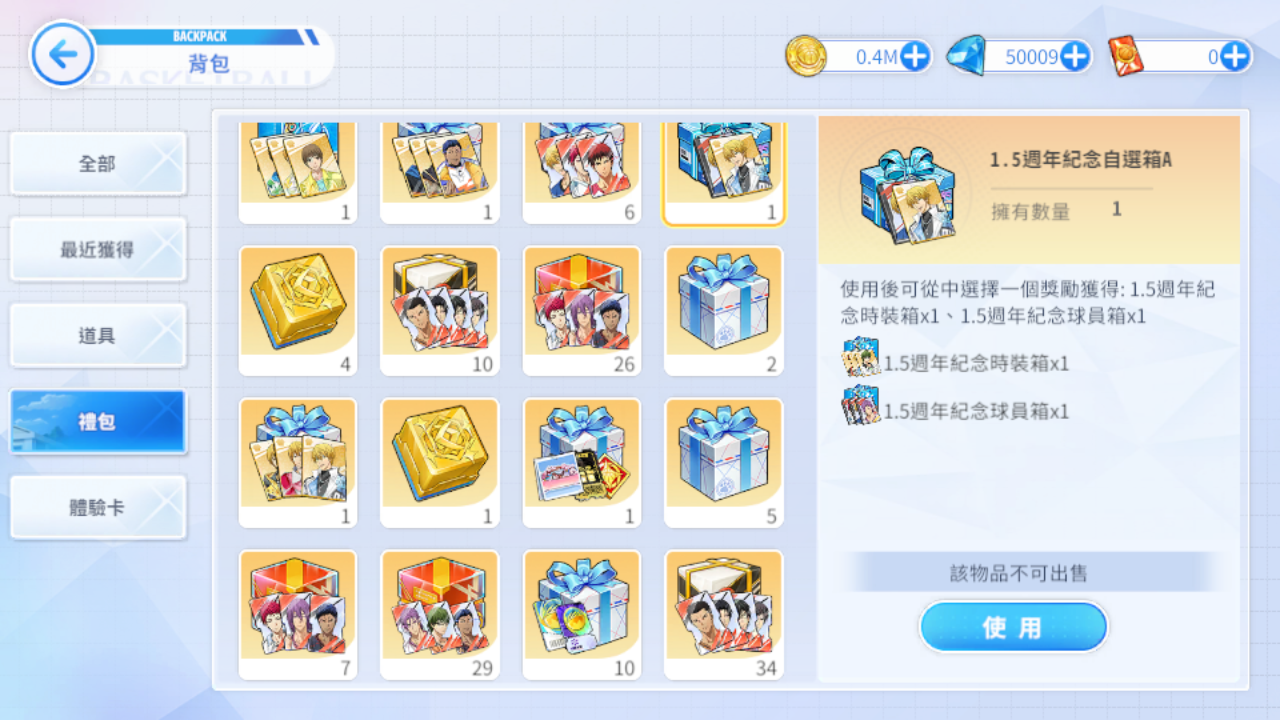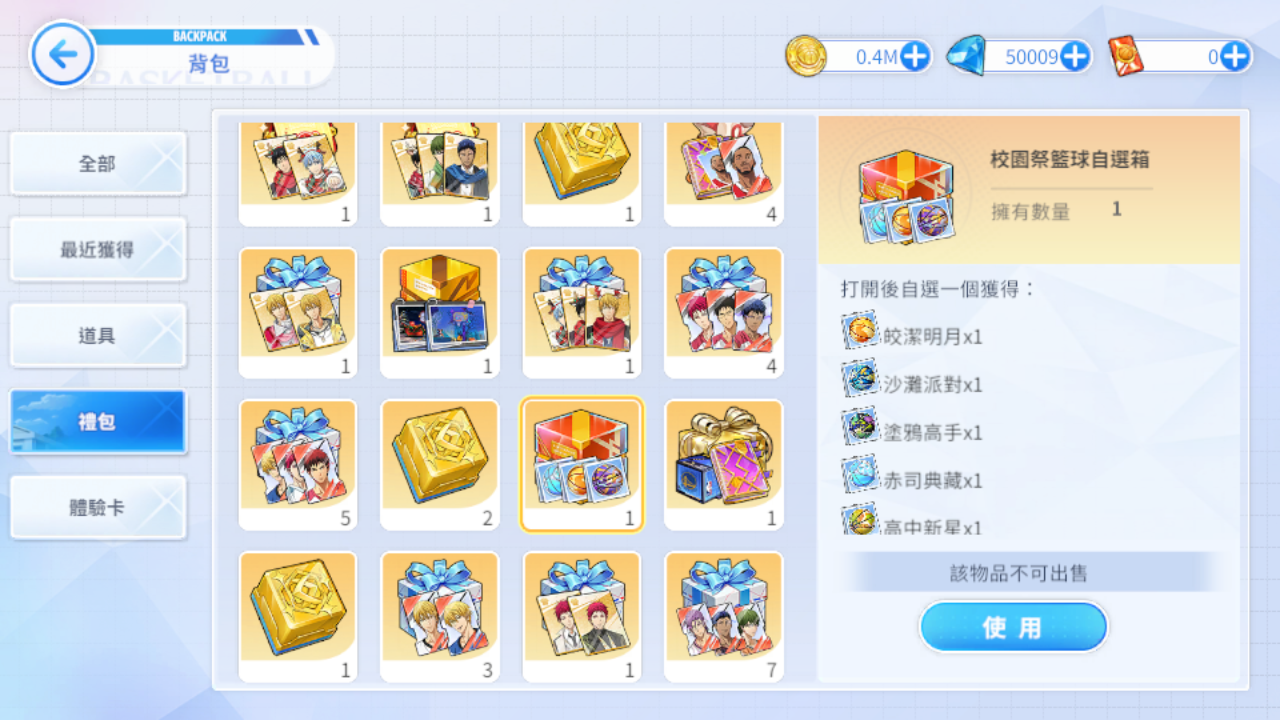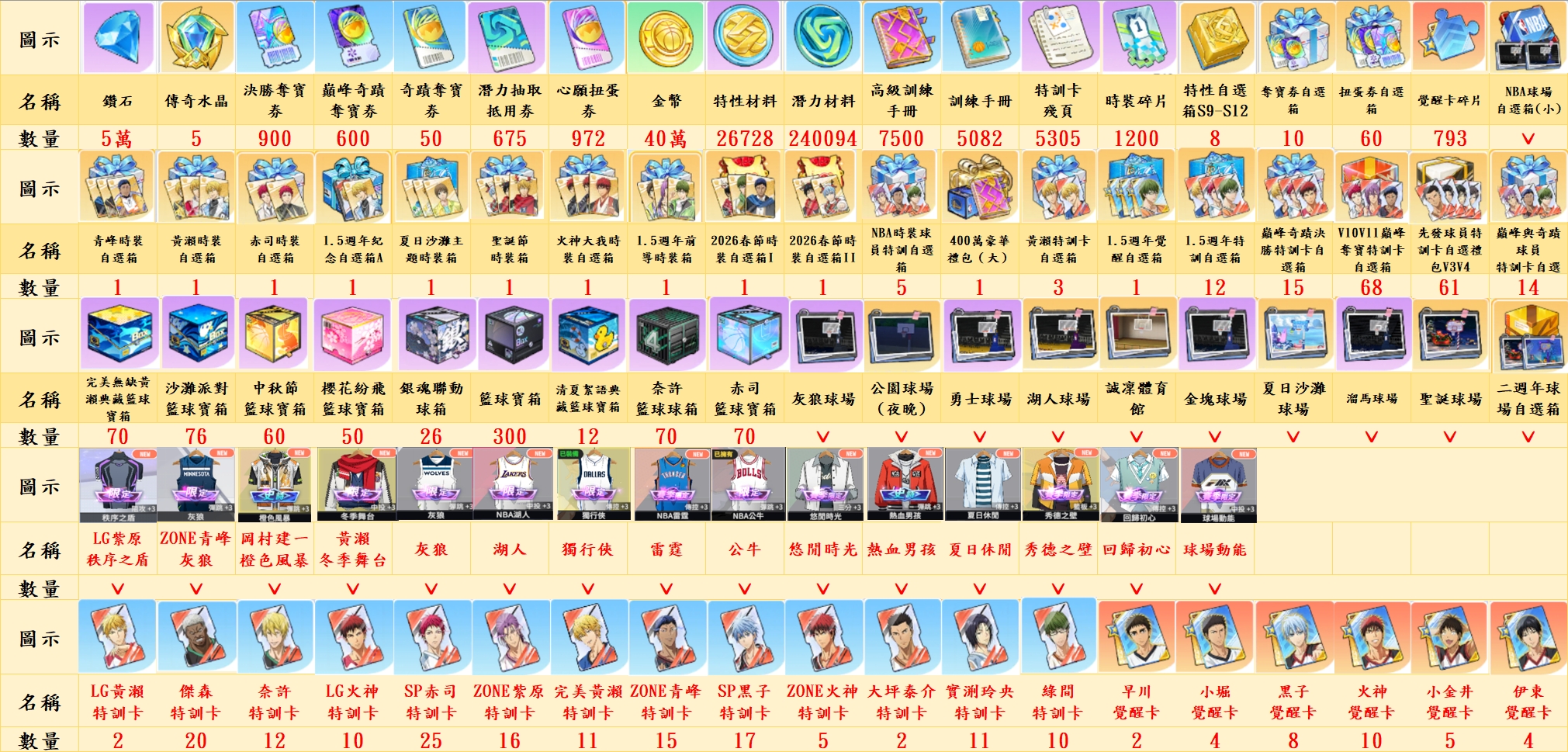 (九)黃瀨時裝自選箱、巔峰與奇蹟覺醒自選箱、青峰時裝自選箱、赤司時裝自選箱、夏日沙灘主題時裝、聖誕節時裝箱、1.5週年紀念自選箱A、黃瀨時裝自選箱、2026年春節時裝自選箱I、2026年春節時裝自選箱II