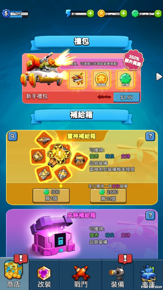 21億鑽石 + 21億金幣 + 21億體力 + 21億強化罐 + 6款裝備卷各21億 = 700