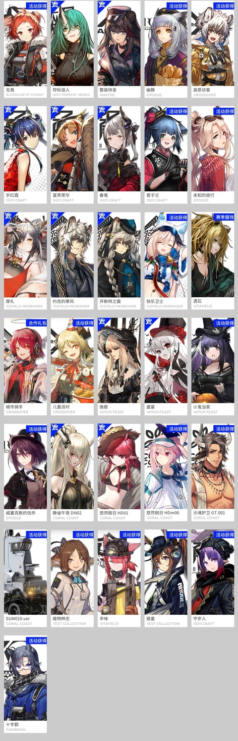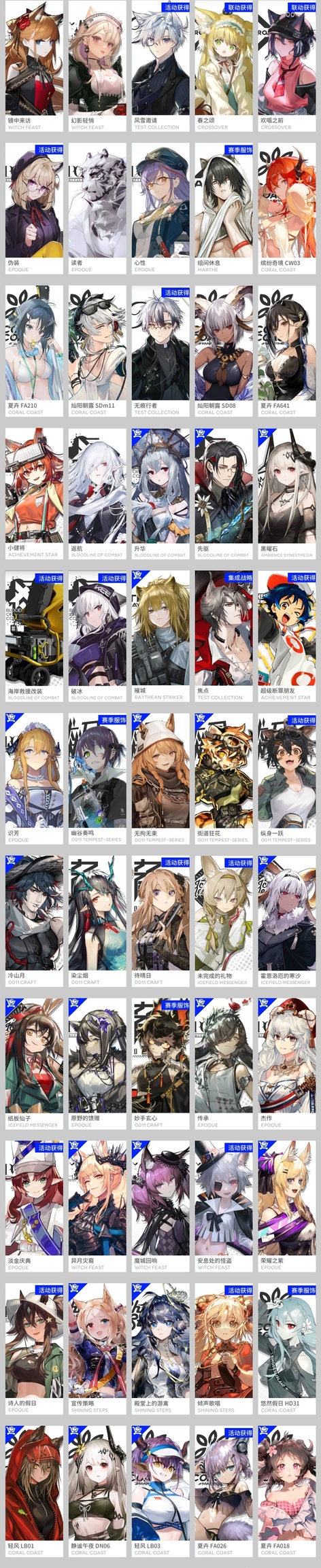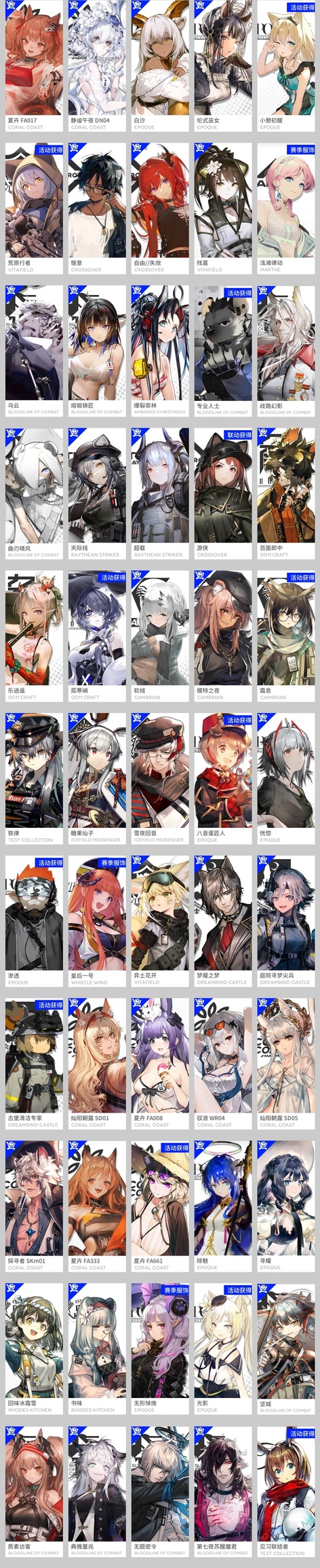 風笛,繆爾賽思,琴柳,艾麗妮,百鍊嘉維爾,仇白,煌,棘刺,瑪恩納,山,聖約送葬人,史爾特爾,薇薇安娜,耀騎士臨光,銀灰,重嶽,斥罪,號角,泥岩,塞雷婭,森蚺,星熊,W,菲亞梅塔,黑,鴻雪,假日威龍陳,空弦,能天使,提豐,艾雅法拉,澄閃,伊芙利特,異客,純燼艾雅法拉,凱爾希,流明,閃靈,焰影葦草,夜鶯,令,塑心,濁心斯卡蒂,阿斯卡綸,歸溟幽靈鯊,緘默德克薩斯,麒麟R夜刀,嵯峨,伺夜,推進之王,焰尾,伊內絲,陳,赫拉格,帕拉斯,斯卡蒂,瑕光,灰燼,迷迭香,遠牙,早露,黑鍵,霍爾海雅,卡涅利安,刻俄柏,林,莫斯提馬,夕,安潔莉娜,淬羽赫默,靈知,鈴蘭,麥哲倫,阿,多蘿西,歌蕾蒂婭,傀影,老鯉,琳琅詩懷雅,水月,溫蒂,止頌