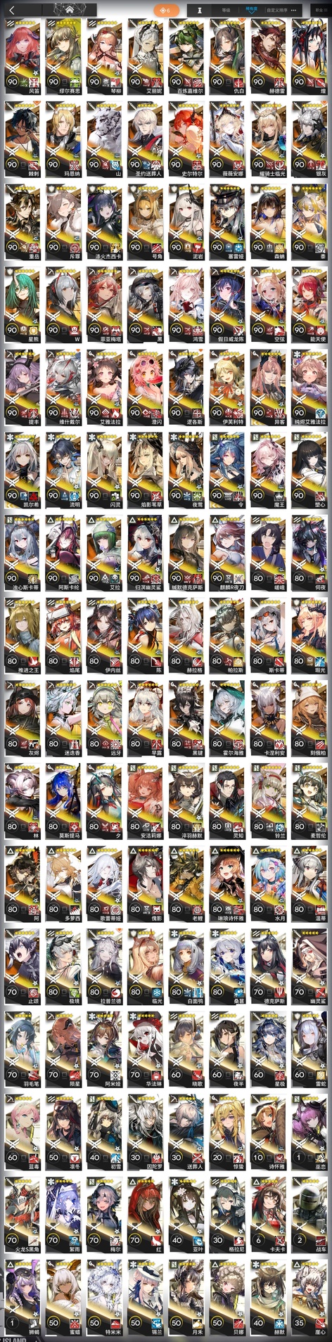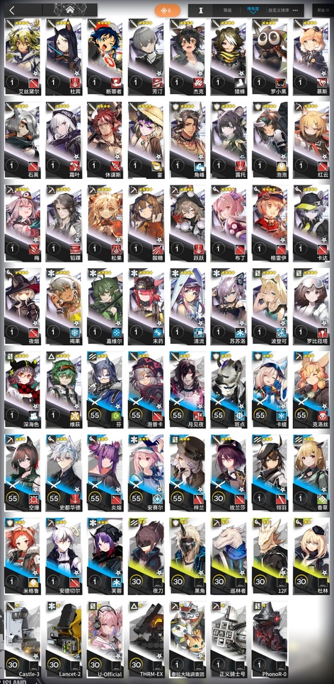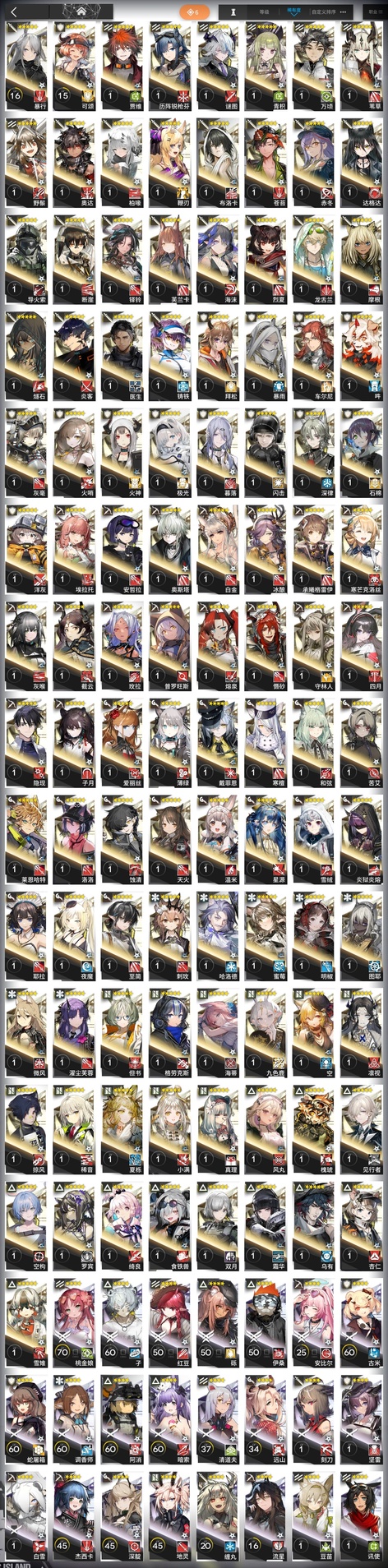 極境,拉普蘭德,臨光,白麵鴞,桑葚,德克薩斯,幽靈鯊,羽毛筆,隕星,阿米婭,華法琳,夜半,星極,雷蛇,藍毒,凜冬,初雪,因陀羅,送葬人,驚蟄,詩懷雅,巫戀,火龍S黑角,絮雨,梅爾,紅,亞葉,格拉尼,卡夫卡,戰車,獅蠍,蜜蠟,特米米,錫蘭,月禾,貝娜,赫默,崖心,暴行,可頌,賈維,謎圖,青枳,葦草,野鬃,奧達,柏喙,鞭刃,布洛卡,蒼苔,赤冬,斷崖,鐸鈴,芙蘭卡,烈夏,龍舌蘭,摩根,燧石,炎客,鑄鐵,拜松,暴雨,車爾尼,吽,灰毫,火哨,火神,極光,暮落,閃擊,深律,石棉,洋灰,埃拉託,安哲拉,奧斯塔,白金,承曦格雷伊,寒芒克洛絲,灰喉,截雲,玫拉,普羅旺斯,熔泉,懾砂,守林人,四月,隱現,子月,愛麗絲,薄綠,寒檀,和絃,苦艾,萊恩哈特,洛洛,蝕清,天火,溫米,星源,雪絨,炎獄炎熔,耶拉,夜魔,哈洛德,蜜莓,明椒,圖耶,微風,濯塵芙蓉,但書,格勞克斯,海蒂,九色鹿,空,凜視,掠風,稀音,夏櫟,真理,風丸,槐琥,見行者,空構,羅賓,綺良,食鐵獸,霜華,烏有,雪雉