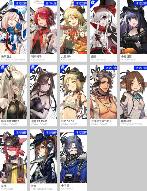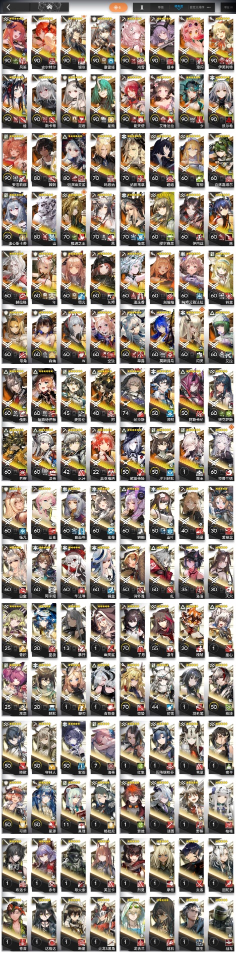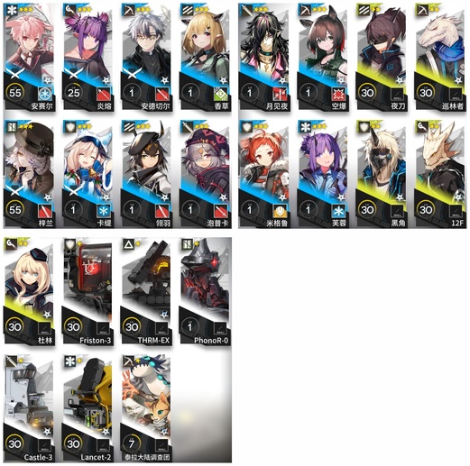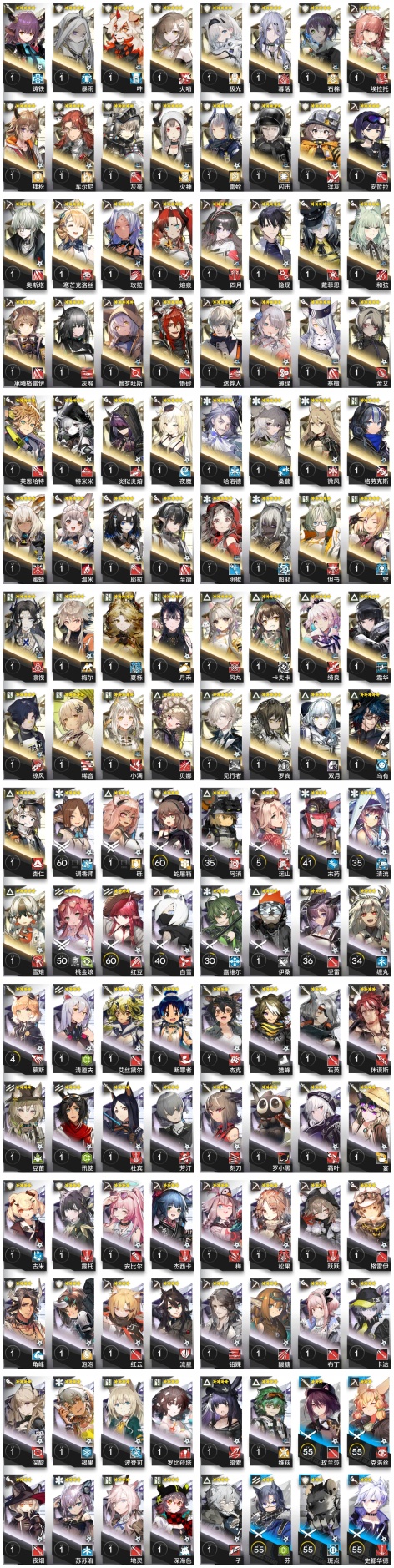 森蚺,焰影葦草,史爾特爾,安潔莉娜,阿斯卡綸,塞雷婭,夜鶯,夕,歸溟幽靈鯊,鴻雪,凱爾希,瑕光,伊芙利特,風笛,鈴蘭,琳琅詩懷雅,赫拉格,銀灰,迷迭香,號角,琴柳,淬羽赫默,帕拉斯,斯卡蒂,刻俄柏,歌蕾蒂婭,阿,麥哲倫,星熊,陳,煌,艾雅法拉,黑,嵯峨,老鯉,W,閃靈,能天使,推進之王,流明,純燼艾雅法拉,空弦,莫斯提馬,早露,澄閃,泥岩,提豐,遠牙,棘刺,伊內絲,山,灰燼,濁心斯卡蒂,溫蒂,年,繆爾賽思,菲亞梅塔,傀影,瑪恩納,百鍊嘉維爾