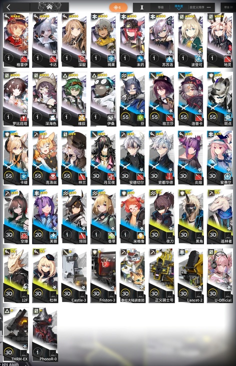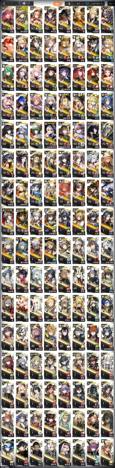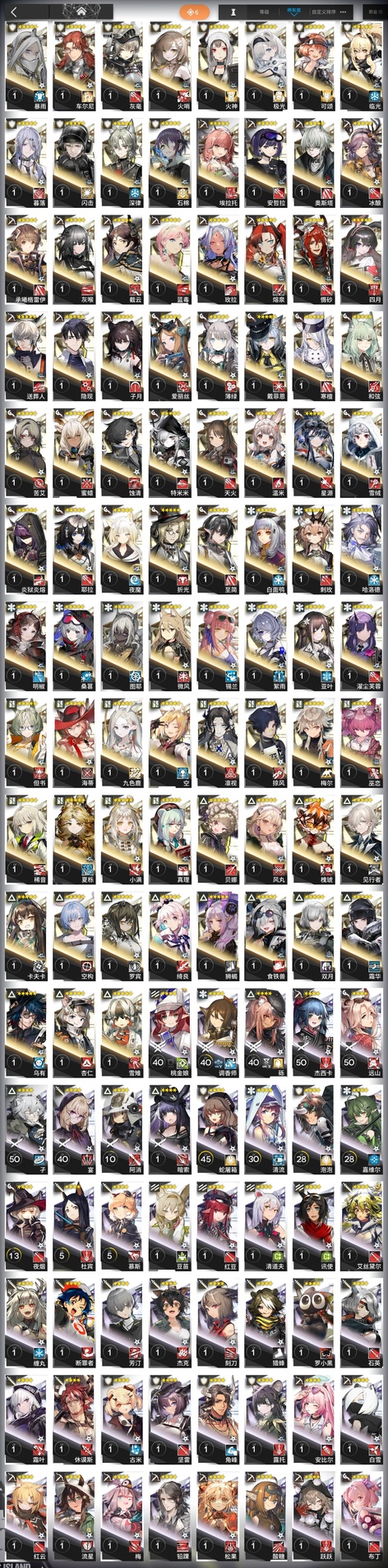 蜜莓,極境,阿米婭,拉普蘭德,羽毛筆,洛洛,華法琳,德克薩斯,隕星,葦草,雷蛇,赫默,紅,吽,白金,寒芒克洛絲,守林人,驚蟄,初雪,格勞克斯,夜半,崖心,普羅旺斯,萊恩哈特,月禾,格拉尼,賈維,凜冬,謎圖,青枳,野鬃,奧達,柏喙,暴行,鞭刃,布洛卡,蒼苔,赤冬,鐸鈴,芙蘭卡,火龍S黑角,烈夏,龍舌蘭,摩根,詩懷雅,燧石,星極,炎客,因陀羅,幽靈鯊,戰車,鑄鐵,拜松,暴雨,車爾尼,灰毫,火哨,火神,極光,可頌,臨光,暮落,閃擊,深律,石棉,埃拉託,安哲拉,奧斯塔,承曦格雷伊,灰喉,截雲,藍毒,玫拉,熔泉,懾砂,四月,送葬人,隱現,子月,愛麗絲,薄綠,寒檀,和絃,苦艾,蜜蠟,蝕清,特米米,天火,溫米,星源,雪絨,炎獄炎熔,耶拉,夜魔,折光,白麵鴞,哈洛德,明椒,桑葚,圖耶,微風,錫蘭,絮雨,亞葉,濯塵芙蓉,但書,海蒂,九色鹿,空,凜視,掠風,梅爾,巫戀,稀音,夏櫟,真理,貝娜,風丸,槐琥,見行者,卡夫卡,空構,羅賓,綺良,獅蠍,食鐵獸,霜華,烏有,雪雉