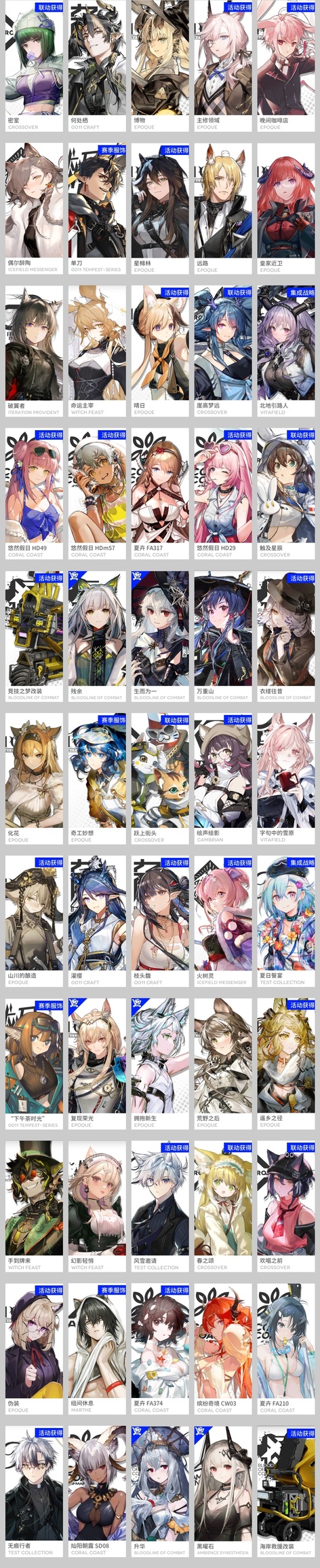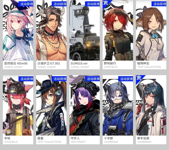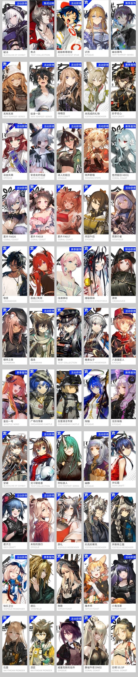 風笛,繆爾賽思,琴柳,伊內絲,棘刺,鐧,瑪恩納,山,史爾特爾,耀騎士臨光,重嶽,斥罪,號角,泥岩,塞雷婭,星熊,W,鴻雪,灰燼,假日威龍陳,萊伊,能天使,艾雅法拉,澄閃,莫斯提馬,純燼艾雅法拉,凱爾希,焰影葦草,夜鶯,鈴蘭,令,塑心,濁心斯卡蒂,歸溟幽靈鯊,緘默德克薩斯,麒麟R夜刀,嵯峨,艾麗妮,陳,煌,帕拉斯,銀灰,黑,迷迭香,刻俄柏,伊芙利特,流明,閃靈,安潔莉娜,白鐵,阿,歌蕾蒂婭,傀影,老鯉,溫蒂,淬羽赫默,伺夜,推進之王,止頌,遠牙,霍爾海雅,卡涅利安,琳琅詩懷雅