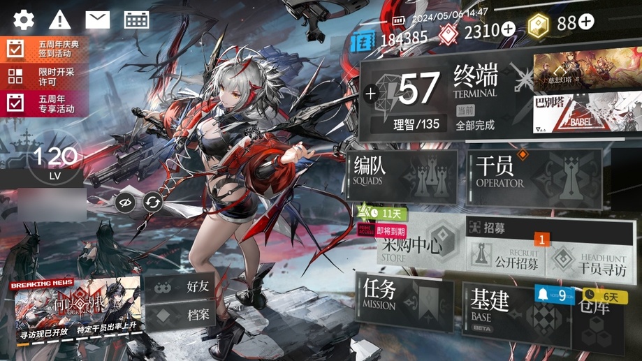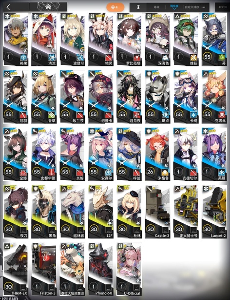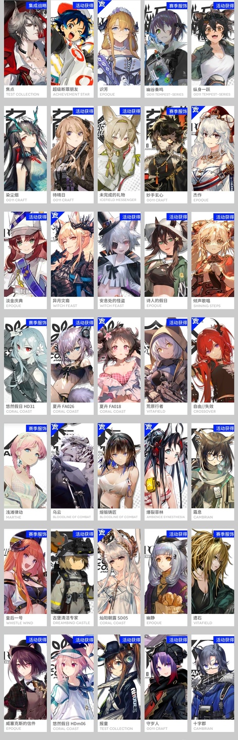 繆爾賽思,陳,煌,棘刺,鐧,瑪恩納,史爾特爾,銀灰,號角,塞雷婭,假日威龍陳,能天使,維什戴爾,艾雅法拉,純燼艾雅法拉,凱爾希,令,百鍊嘉維爾,斥罪,風笛,山,泥岩,澄閃,林,焰影葦草,夜鶯,塑心,濁心斯卡蒂,緘默德克薩斯,麒麟R夜刀,溫蒂,伊芙利特,焰尾,帕拉斯,薇薇安娜,森蚺,瑕光,星熊,早露,夕,異客,靈知,鈴蘭,歸溟幽靈鯊,傀影,琴柳,流明,老鯉,阿,霍爾海雅,莫斯提馬,歌蕾蒂婭,嵯峨,琳琅詩懷雅,推進之王,伺夜,赫拉格,卡涅利安,白鐵,淬羽赫默,麥哲倫,水月,止頌,空弦