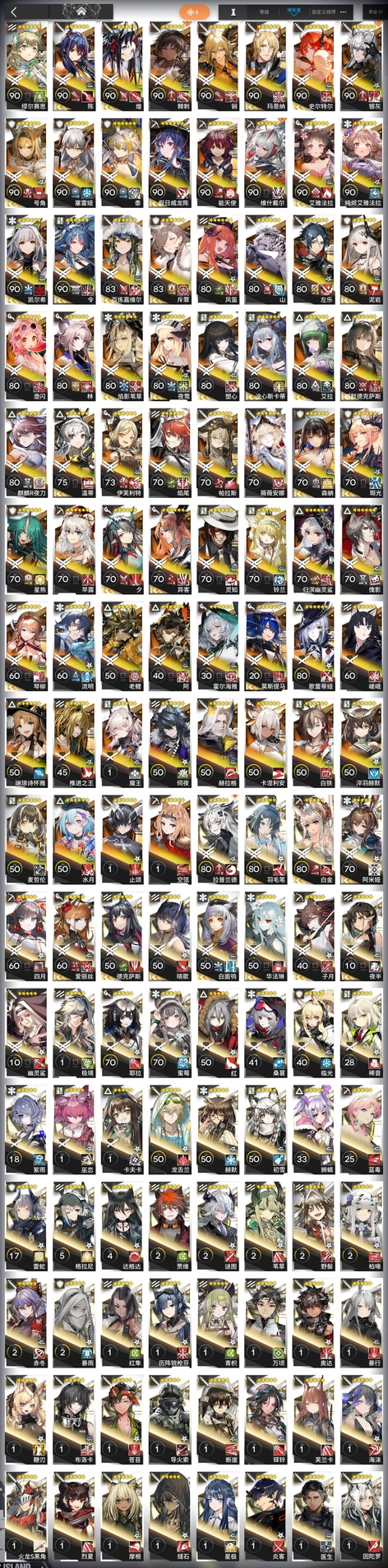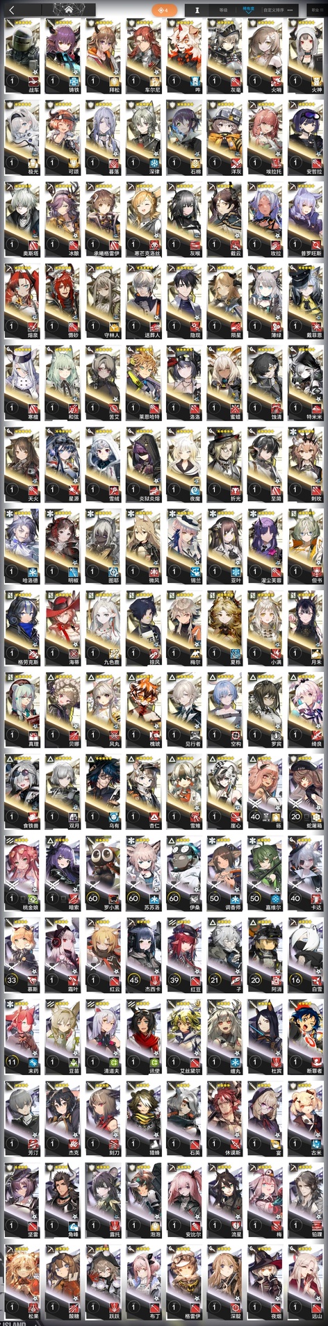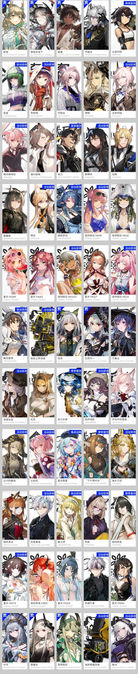 拉普蘭德,羽毛筆,白金,阿米婭,四月,愛麗絲,德克薩斯,白麵鴞,華法琳,子月,夜半,幽靈鯊,極境,耶拉,蜜莓,紅,桑葚,臨光,稀音,絮雨,巫戀,卡夫卡,龍舌蘭,赫默,初雪,獅蠍,藍毒,雷蛇,格拉尼,賈維,謎圖,葦草,野鬃,柏喙,赤冬,暴雨,歷陣銳槍芬,青枳,奧達,暴行,鞭刃,布洛卡,蒼苔,斷崖,鐸鈴,芙蘭卡,火龍S黑角,烈夏,摩根,燧石,星極,炎客,因陀羅,戰車,鑄鐵,拜松,車爾尼,吽,灰毫,火哨,火神,極光,可頌,暮落,深律,石棉,洋灰,埃拉託,安哲拉,奧斯塔,承曦格雷伊,寒芒克洛絲,灰喉,截雲,玫拉,普羅旺斯,熔泉,懾砂,守林人,送葬人,隱現,隕星,薄綠,寒檀,和絃,苦艾,萊恩哈特,洛洛,蜜蠟,蝕清,特米米,天火,星源,雪絨,炎獄炎熔,夜魔,折光,哈洛德,明椒,圖耶,微風,錫蘭,亞葉,濯塵芙蓉,但書,格勞克斯,海蒂,九色鹿,掠風,梅爾,夏櫟,月禾,真理,貝娜,風丸,槐琥,見行者,空構,羅賓,綺良,食鐵獸,烏有,雪雉,崖心