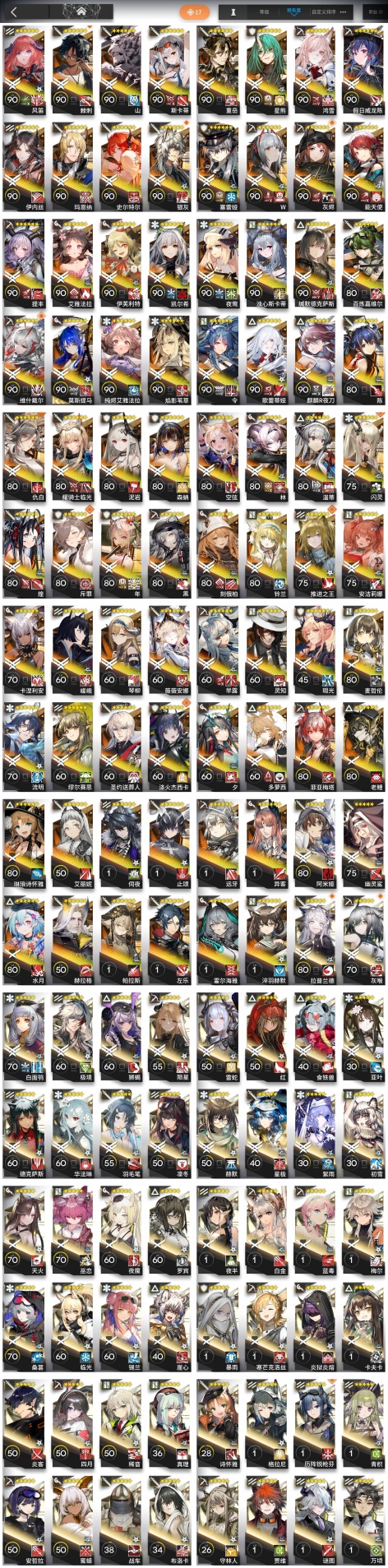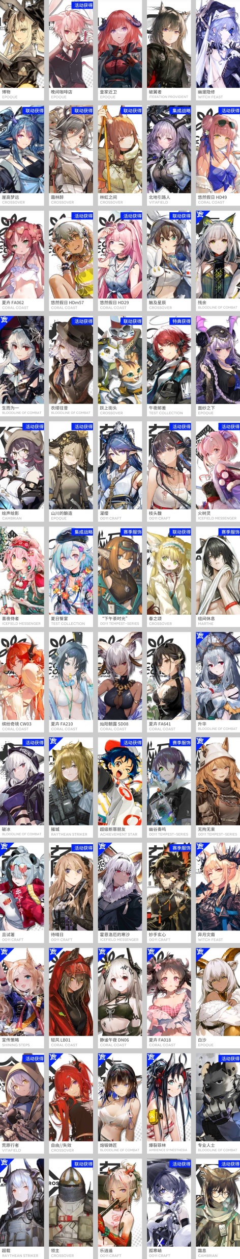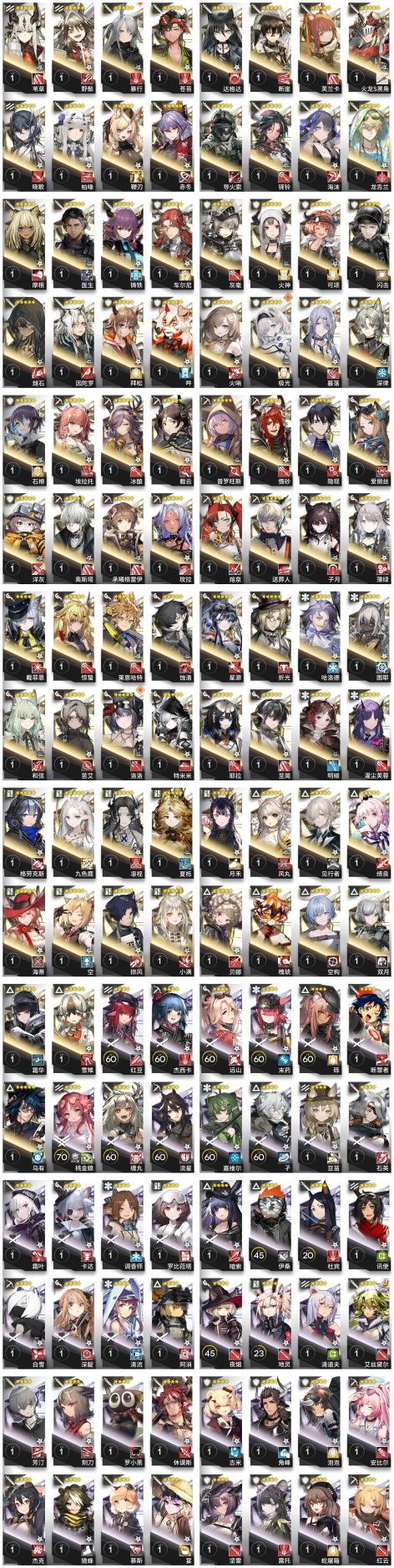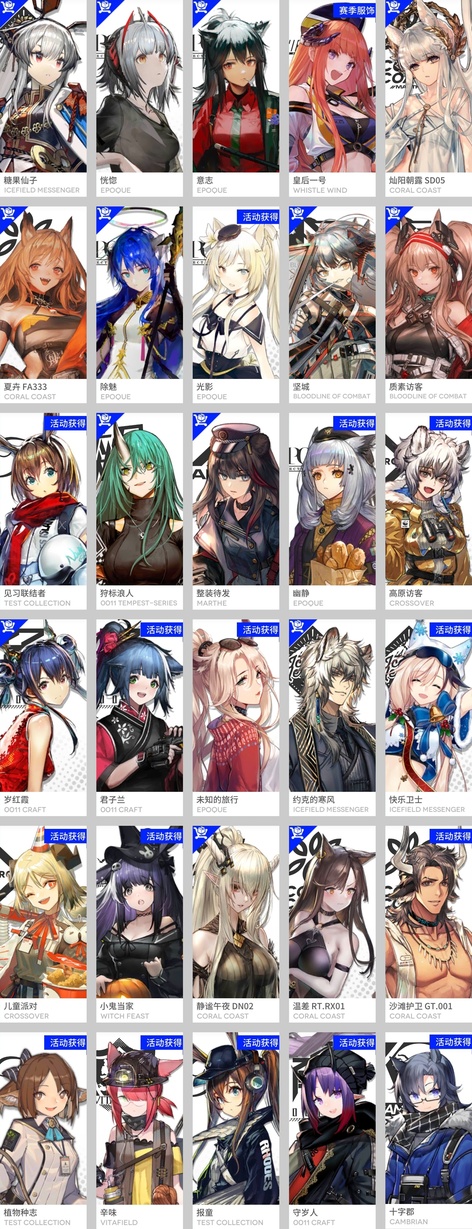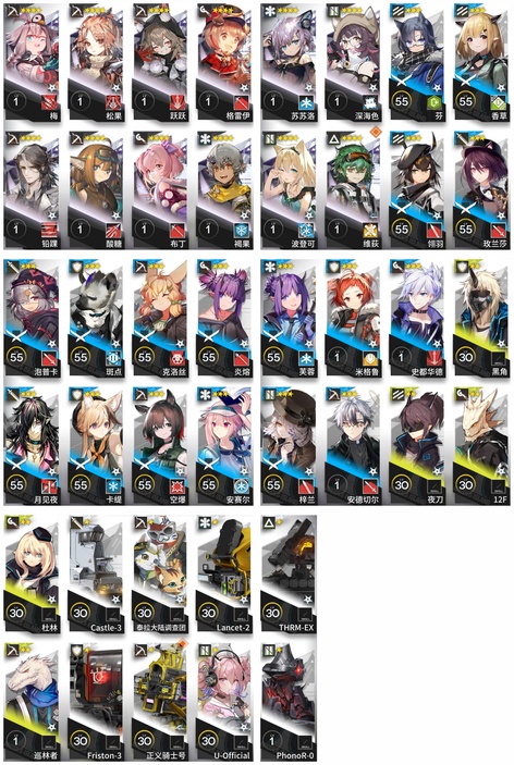 森蚺,霍爾海雅,焰影葦草,史爾特爾,安潔莉娜,塞雷婭,重嶽,夜鶯,夕,林,鴻雪,凱爾希,瑕光,仇白,伊芙利特,靈知,風笛,鈴蘭,薇薇安娜,琳琅詩懷雅,赫拉格,銀灰,假日威龍陳,伺夜,琴柳,淬羽赫默,帕拉斯,斯卡蒂,刻俄柏,緘默德克薩斯,歌蕾蒂婭,多蘿西,麥哲倫,星熊,陳,卡涅利安,煌,艾雅法拉,黑,嵯峨,老鯉,耀騎士臨光,W,水月,閃靈,能天使,推進之王,流明,純燼艾雅法拉,空弦,莫斯提馬,令,早露,聖約送葬人,斥罪,泥岩,異客,提豐,遠牙,止頌,棘刺,伊內絲,山,灰燼,濁心斯卡蒂,溫蒂,年,繆爾賽思,菲亞梅塔,麒麟R夜刀,瑪恩納,艾麗妮,百鍊嘉維爾